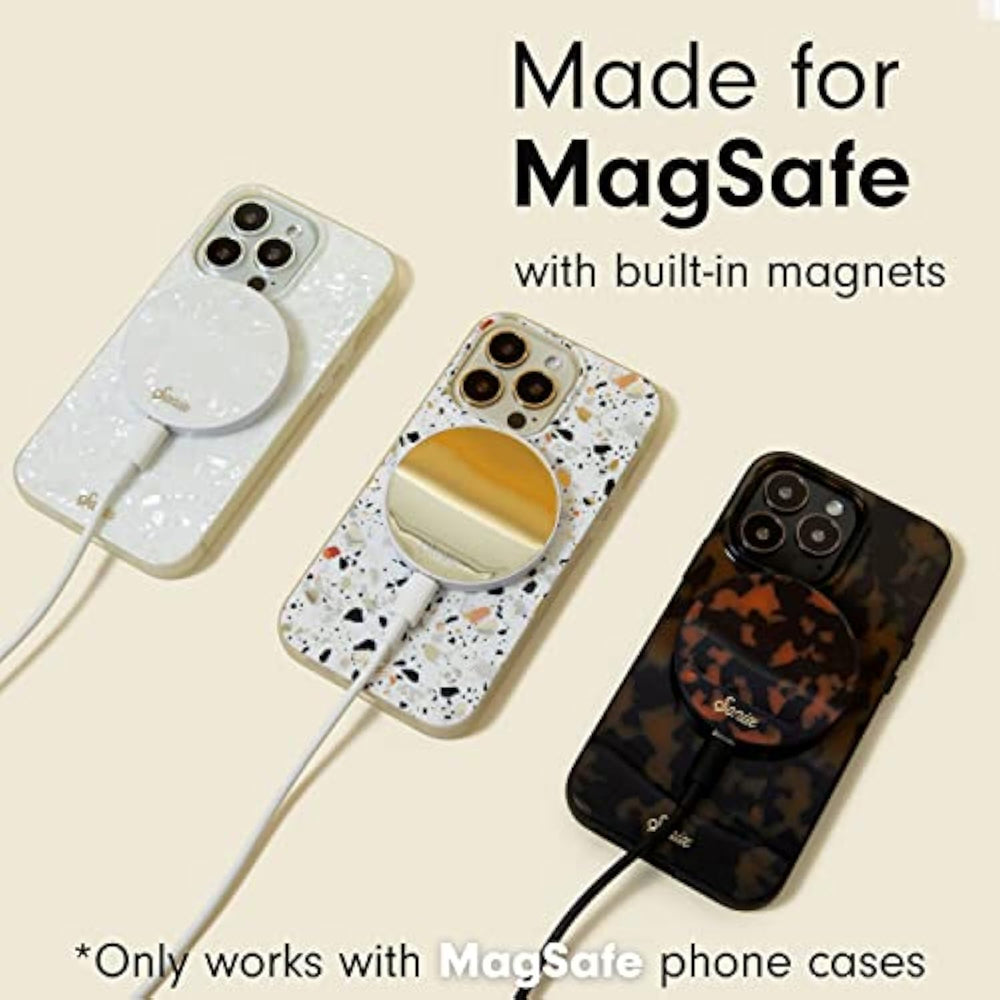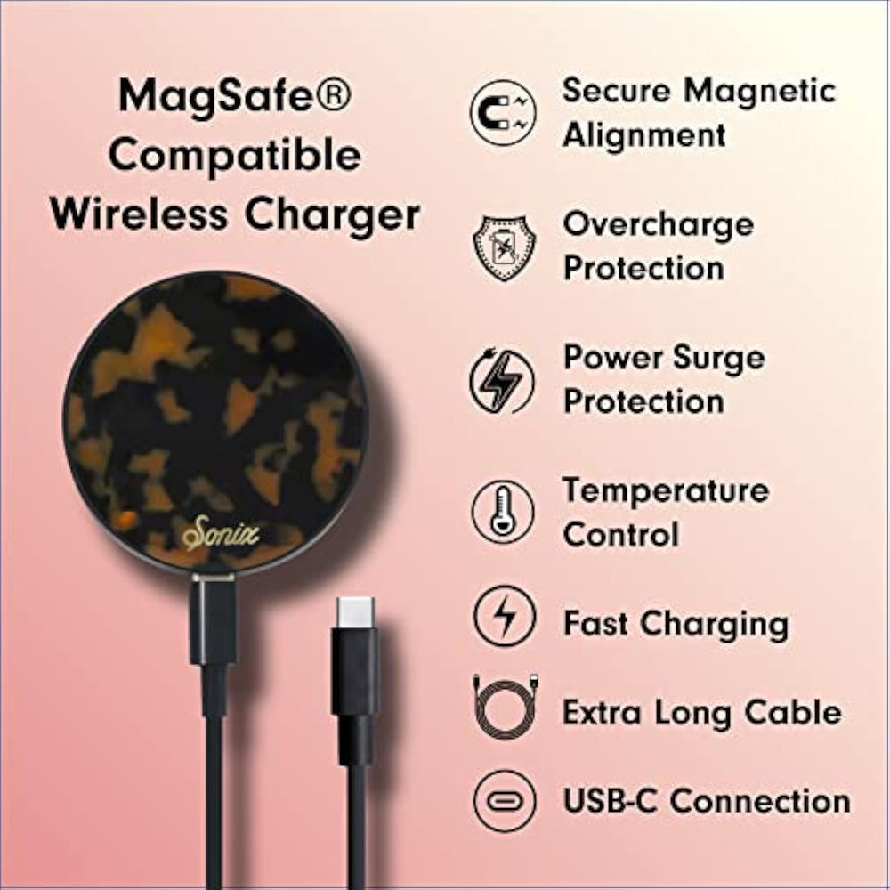 | [Compatible with MagSafe]: Self-aligning magnetic disk allows precise alignment for a fast and efficient charge for your - Besides that, it can charge your AirPods Pros | | [Fast and Safe]: 10W output with Intelligent Charging Technology provides overheat protection, surge, and short-circuit protection to prevent your iPhone from overheating, preserving optimizing battery life while offering a faster and safer charging experience | | [Complete Charging Convenience]: Eliminate the hassle of unplugging and plugging again. Simply place the charger disk in the center of your iPhone to power up! Features our elegantly classic brown tortoise shell print, also reminiscent of a leopard, cheetah skin | | [MagSafe Case Required]: Keep the case on. Charges directly through certified MagSafe phone cases. Need a case Snag our matching Sonix MaSafe compatible cases for best results | | [Extra-long]: Charger cable extends up to 6.5 feet (2 meter) for flexible and hassle-free charging. USB-C connection. *USB-C wall adapter not included | |