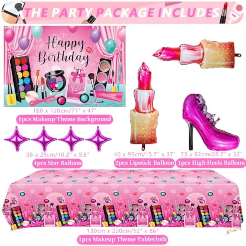 | Spa Party Design: All Kinds Of Cosmetics With The Theme Of Makeup, Such As Lipstick, Perfume, Makeup Bags, Eye Black, Mirrors, Etc., Fully Conform To The Fantasy Of Girls On The Theme Of Makeup. If You Buy Cosmetics-Themed Birthday Party Supplies For Your Girl On The Theme Of Your Birthday, This Party Will Make The Girl Unforgettable. | | Makeup Birthday Decorations Girl: 1Pc Happy Birthday Makeup Backdrop + 1Pc Makeup Happy Birthday Cake Topper + 10Pcs Makeup Theme Cupcake Topper + 114Pcs Balloons Garland Kit Arch ?Dark Pink, Blue, Purple, Pink?+ 20Pcs 9" Dinner Plates + 20Pcs 7" Dessert Plates + 20Pcs 9Oz Paper Cups + 20Pcs Napkins + 20 Set Forks Knives Spoons + 20Pcs Straws + + 4Pcs Foil Balloon?High Heel / Lipstick / Lip? + 1Pc Pink Spa Makeup Table Cover, Balloon Ribbons, And Glue Points Are Also Provided. | | Materials: All Plates, Cup And Napkins Are Made With Paper. They Do Not Tear Or Break Easily. Perfect To Serve Desserts, Food For Parties, And Drinks. | | Easy To Decorate - This Makeup Birthday Party Backdrop Is Punched At The 4 Corners And Comes With A 6 M White Long Rope Suitable For Indoor Or Outdoor Walls, Playground Decoration, Etc, Only Needing Some Time To Inflate The Balloons. Throw Away The Cutlery Set After Use To Save Time And Spend More Time Enjoying The Party With Guests And Children. | | Wide Applications: Our Makeup Party Supplies Set Are Versatile And Perfect For Various Occasions Such As Makeup Theme Birthday Parties, And Slumber Party Decorations, But Also For Spa Day Parties, Girls' Spa Parties, Kids Spa Party, Pink Party, Spa-Themed Birthday Parties, Spa Table Decorations, And Other Theme Party Decor. | |