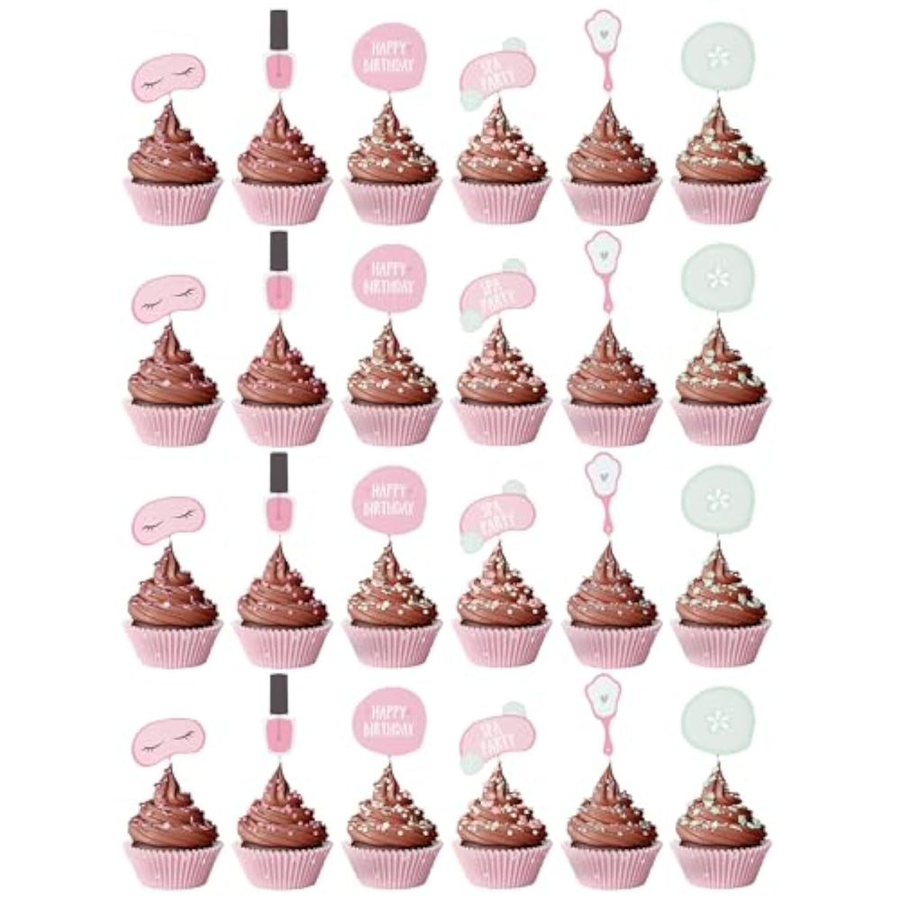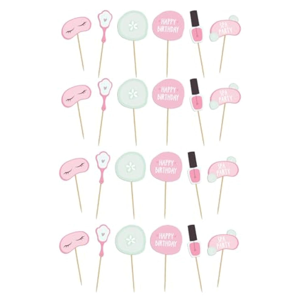 | **24 Premium Spa Party Cupcake Toppers** 24 Double-Sided Toppers Made Of Sturdy Cardstock Attached To 3.5" Toothpick. Each Topper Is 1"-2.25" Wide X 1.25"-2.25" Tall Depending On The Design. | | **6 Unique Designs** Ideal Spa Birthday Party Decorations With 6 Whimsical Designs: 'Happy Birthday' Sign, 'Spa Party' Sign, Spa Mask, Cucumber, Mirror And Nail Polish. Set Includes 4 Of Each Design. | | **Pre-Assembled, No Diy** Just Add Them To Your Cupcakes For A Quick And Easy Decorative Touch Or Use Them Together As A Spa Party Cake Topper To Enhance Your Spa Party Decorations. | | **Part Of Spa Party Collection** Perfect Spa Birthday Party Supplies For Girls, These Spa Cupcake Toppers For Girls Are Designed To Match The Spa Party Decor Collection. | | **Whimsical And Beautiful** These Girly Cupcake Toppers Are Essential Spa Party Supplies, Offering A Charming Addition To Your Spa Party Decor, Perfect For A Little Girls Birthday Celebration. | |