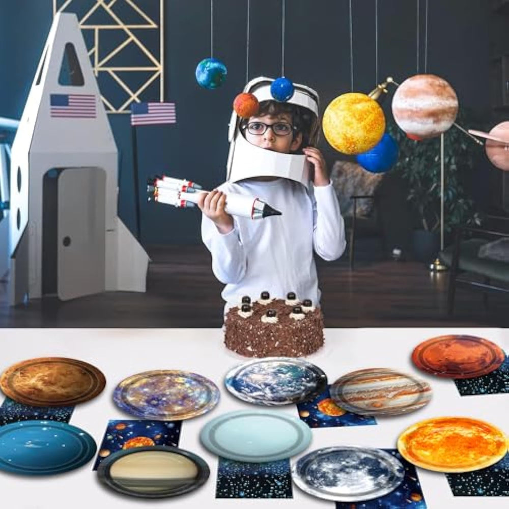 | Outer Space Party Decorations:You Will Get 100Pcs Space Themed Party Supplies,50 X Space Party Paper Plates(9β), Including 10 Different Designs Of Solar System Planets, 5Pcs For Per Pattern; 50 X Space Party Paper Napkins(Open Size:33*33Cm),It Contains Two Designs, 25Pcs Each. | | Premium Material: Space Solar System Theme Plates And Napkins Are Made Of Quality Paper, Non-Toxic, No Smell, Heat-Resistant And Durable. The Pattern And Color Are Well-Printed And Fade-Resistant To Provide You With A Party Full Of Outer Space Theme Atmosphere. | | Save Your Time: With Our Solar System Planet Dessert Plates And Napkins, You Can Easily Enjoy The Party With Friends, Family And Kids. After The Party, Cleanup Is As Simple As Throwing All Tableware Waste Into The Trash Can, Reducing Cleaning Time. | | Vibrant Space Party Design: These Different Designs Of Outer Space Plates And Napkins Are Perfect Decorations For Children'S Parties, Solar System Planet Parties, And A Great Way To Create A Space Atmosphere With Friends And Family. | | Wide Application: Space Themed Party Supplies Are Ideal For Solar System Space Theme Party, Happy Birthday Party, Astronaut Theme Birthday Party, The Delicate Space Galaxy Pattern Will Create A Fantastic Scene, Bringing You Enjoyable Party Time | |