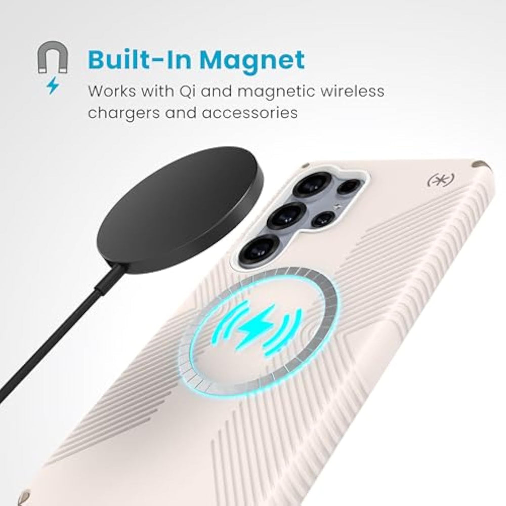 | 13-Foot Drop Protection - Designed with advanced clear impact technology, this case for Samsung S25 ultra absorbs shock and cushions your phone against drops from up to 13 feet, providing unmatched durability. | | No-Slip Inverted Grips - This S25 Ultra phone case features newly innovated inverted grips which provide a strong, durable hold for long-lasting use, ensuring secure handling during texting, photography, or everyday activities, while maintaining a slim, sleek profile. | | Built-In Magnet - Enjoy seamless alignment with Qi wireless chargers and securely connect your phone to magnetic accessories, including wallets, battery packs, and mounts. The powerful built-in magnet on this Samsung 25 ultra case keeps everything in place. | | Enhanced Design Features - With a raised bezel to protect the screen, a raised camera ring to safeguard lenses, and redesigned ultra-responsive buttons for smoother clicks, this Samsung ultra 25 case provides maximum protection and usability. | | SINCE 2001 - Speck has delivered top-notch products. The Samsung case exemplifies this with rigorous lab tests for drops, extreme temperatures, cracks, and bending. | |