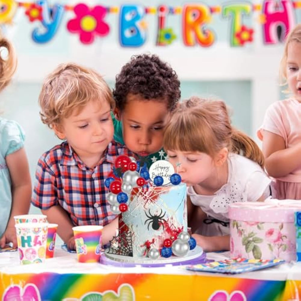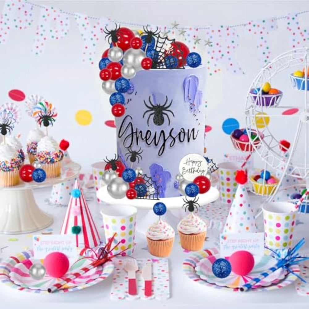 | ?Package Includes?: Spider Themed Cake Topper Includes: 3*Big Red Ball, 2*Small Red Ball, 3*Big Blue Sequin Ball, 3*Small Blue Sequin Ball, 2*Big Silver Ball, 3*Small Silver Ball, 5 Black Sequin Spider, 3*Spider Sequin Web,10*Silver Star, 1* Happy Birthday Topper | | ?Spider Themed Materials?: The Spider Web Cake Decorations Are Made Of High Quality, Safe Paper And Food Grade Sticks With Good Printing. Happy Birthday Cake Topper Is Made Of Acrylic. Silver Pentagrams Are Made Of Plastic. Spider Cupcake Topper Are Light And Won'T Crush Your Cake. Note: Do Not Put The Spider Themed Cake Toppers In Oven | | ?Hero Theme Cake Topper?: This Set Of Spider Cake Decor Is Specially Designed For People Who Love Spider And Animals, Children Will Love This Cake Theme! Red And Blue Ball Colors Match And Different Elements Collide To Add A Lively And Interesting Atmosphere To Your Party And Impress Your Friends | | ?Happy Birthday Toppers Easy To Use?: These Cartoon Spider Cupcake Toppers Are Very Easy To Use. You Can Decorate The Cake Quickly, No Auxiliary Tools Are Needed. These Black Spider Ornaments, Star Cake Toppers, Red And Blue Ball Cake Topper Can Be Placed Directly On The Cake, As Well As On Cupcakes And Any Dessert | | ?Black Spider Party Decorations?: Our Hero Cake Decoration Is Very Suitable For Celebrating Spider Themed Party, Baby Shower Party, Spider Themed Birthday Party For Boys Birthday Party. If You Have Any Questions Please
