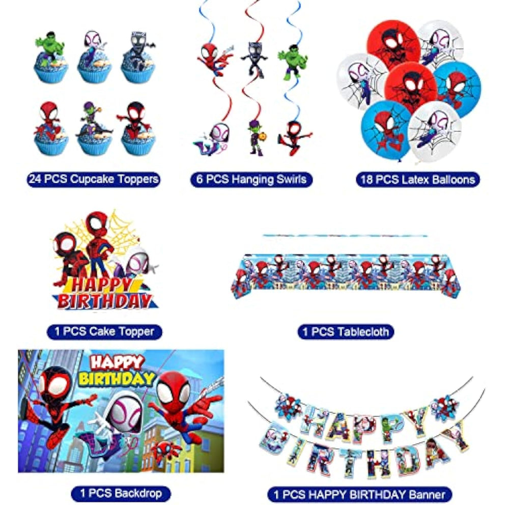 | ?Package Includes? This Spidey Party Decorations Kit Includes 1Pcs Happy Birthday Banner, 1Pcs Backdrop, 1Pcs Tablecloth, 1Pcs Cake Topper, 6Pcs Hanging Swirls, 24Pcs Cupcake Toppers, 18Pcs Latex Balloons(3Style). It Has Everything You Need For A Spidey Themed Birthday Party. | | ?High Quality? All Of Our Spidey Birthday Decorations Are Made Of High-Quality Materials, Which Are Safe And Non-Toxic. The Balloons Made With Natural Latex, Non-Toxic. Every Balloons Have Been Rigorously Tested And Selected Manually. Extra Thick, Unlike Ordinary Balloons, The Color Is More Full And Not Explosive, They Are Safe To Be Used For Children. | | ?Unique Design? The Vivid Print And Vibrant Colors Of Our Spidey Party Supplies Set Will Create The Most Celebratory Atmosphere For You And Your Guests. With Its Stylish Design And Cute Characters, It'S Sure To Be A Hit With Both Kids And Adults! | | ?Wide Application? Our Spidey Birthday Decorations Kit Are Suitable For Most Events, Such As Spidey Themed Party, Dining, Outdoor Activities, Can Create An Enjoyable And Active Atmosphere To These Scenes. If You Are Going To Throw A Spidey Party, The Decorations Kit Make For Fantastic Decorations. | | ?Satisfaction? If You Are Not Satisfied With Our Products, Please Click The "Seller