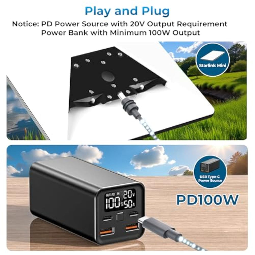 | High-Powered Compatibility : This Usb-C To Dc Cable 10Ft Works Seamlessly With 100W Power Banks Or Pd Chargers, Delivering The Consistent 20V Power Needed To Keep Your Starlink Mini Online In Any Location | | Weather-Resistant Construction : Starlink Mini Type C To Dc Power Cable Engineered With Waterproof Materials, This Cable Is Perfect For Outdoor Adventures, Withstanding Rain, Dirt, And Challenging Conditions To Ensure Dependable Connectivity | | Premium 18Awg Build : Waterproof Starlink Mini Cable Built With High-Quality 18Awg Wiring For Optimal Power Delivery, Minimizing Energy Loss And Enhancing Durability For Reliable Long-Term Use, Even With Frequent Outdoor Exposure | | Easy Setup : Designed For Instant Use With Any 100W+ Pd Power Source—No Need For Complex Adjustments Or Special Tools, Making It An Ideal Plug-And-Play Solution For On-The-Go Power | | Extended Length For Versatility : The 10Ft Length Allows For Greater Flexibility, So You Can Position Your Starlink Mini As Needed While Still Accessing Your Power Source Comfortably | |