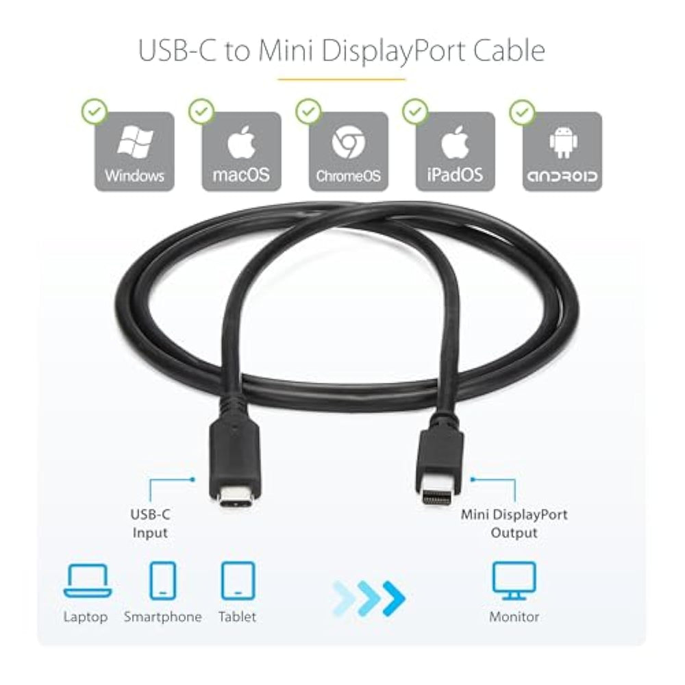 | ADAPTER AND CABLE IN ONE: This USB-C to Mini DP cable lets you connect your Thunderbolt 3, Thunderbolt 4 or USB-C computer to a Mini DisplayPort (mDP) monitor with just one cable | | NOTE: This is not a Thunderbolt cable, not reversible and is not compatible with Thunderbolt peripherals such as Docking Stations, Displays or External Enclosures; This cable connects a USB-C or Thunderbolt 3/4 laptop to a monitor with Mini-DisplayPort | | 4K 60HZ RESOLUTION: USB-C to Mini DisplayPort Cable Adapter delivers UHD picture quality with support for video resolutions up to 4K 60Hz; It's also backwards compatible with 1080p monitors or displays | | HASSLE-FREE SETUP: This USB Type-C to Mini DP adapter cable supports plug-and-play installation on both Windows and Mac computers; No driver installation required | | THUNDERBOLT 3 AND USB-C COMPATIBLE: USB-C to mDP cable works with Thunderbolt 3 / 4 computers and USB Type-C ports supporting video; Please check with your computer manufacturer to confirm video over USB-C (DP Alt mode) support | |