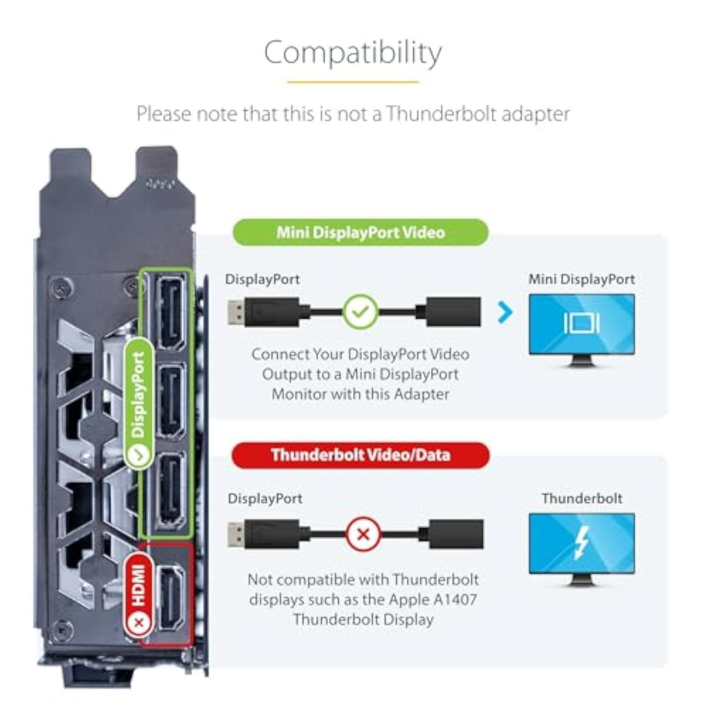 | COMPATIBILITY: This adapter is not compatible with Thunderbolt monitors (e.g., Apple A1407 Thunderbolt Display) and is not suitable for use with iMac in Target Display Mode; Designed to connect DisplayPort computers to Mini DisplayPort monitors | | DISPLAYPORT TO MINI DISPLAYPORT 1.2 CABLE: DP male to mDP female extension cable; 4K (3840x2400p 60Hz) x 2K (2560x1600p 120Hz), 21.6 Gbps, HBR2, 8Ch Audio, Multi-Stream Transport (MST); GTC for precise audio channel timing and 3D Stereo | | RELIABLE DESIGN: DisplayPort to Mini DisplayPort adapter cable has durable ABS connectors with flexible PVC strain relief and jacket prevent fraying or damage due to bending or rough usage; Metal connector sub-structure provides EMI shielding | | QUALITY CONSTRUCTION: 32AWG wire with gold-plated connectors for improved signal integrity and reliability; Superior EMI shielding with Aluminium foil Braid provide higher quality video and audio; Backwards compatible with DP 1.1 | | SPECS: 6 inches (15 cm); Color: Black; DP v1.2; Standard DP Male to Mini-DP Female Converter; 32 AWG PVC cable jacket, ABS connector shell; Shield: Aluminium foil with Braid; Protocols: HBR 2, MST, GTC | | Molded latching connector secures the cable against accidental disconnection | | Designed and manufactured to DisplayPort revision 1.2 standards | | Molded latching connectors with strain relief | |