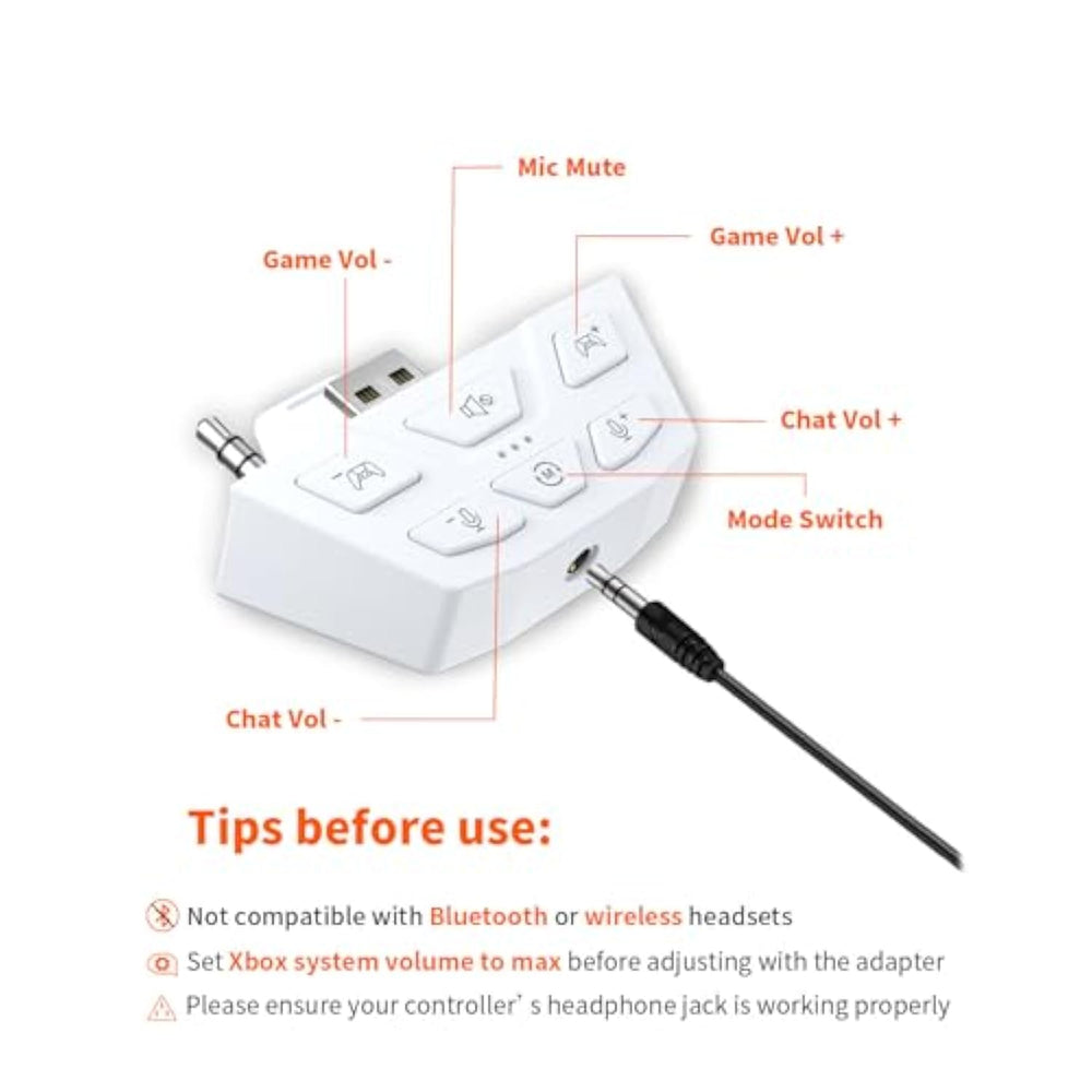 | Versatile Audio Control: Adjust Game/Chat Balance; Control Volume And Mic Mute Directly Without Changing Settings On The Xbox System Or Dropping The Controller; Set System Volume To Max Before Using The Adapter For Best Results | | Easy To Use: Simply Plug The Xbox Stereo Headset Adapter Into The Controller And Connect Your Headset To The 3.5 Mm Port; No Complicated Setup Required; Not Compatible With Bluetooth Or Wireless Headsets | | Broad Compatibility: Works With All Xbox Controllers That Have A 3.5 Mm Headset Jack, Including Xbox One, One S|X, Elite 1, Elite 2, Series S|X; Supports Most 3.5 Mm Headsets With Ctia Plug Standard | | Sound Mode Control: Six Buttons For Game Volume Up/Down, Chat Volume Up/Down, Mic Mute, And Mode Switch; Game Mode Enhances Spatial Sound For Immersive Experience; Fps Mode Highlights Audio Details For Directional Awareness | | What You Get: Package Includes 1× Headset Adapter And A User Manual;