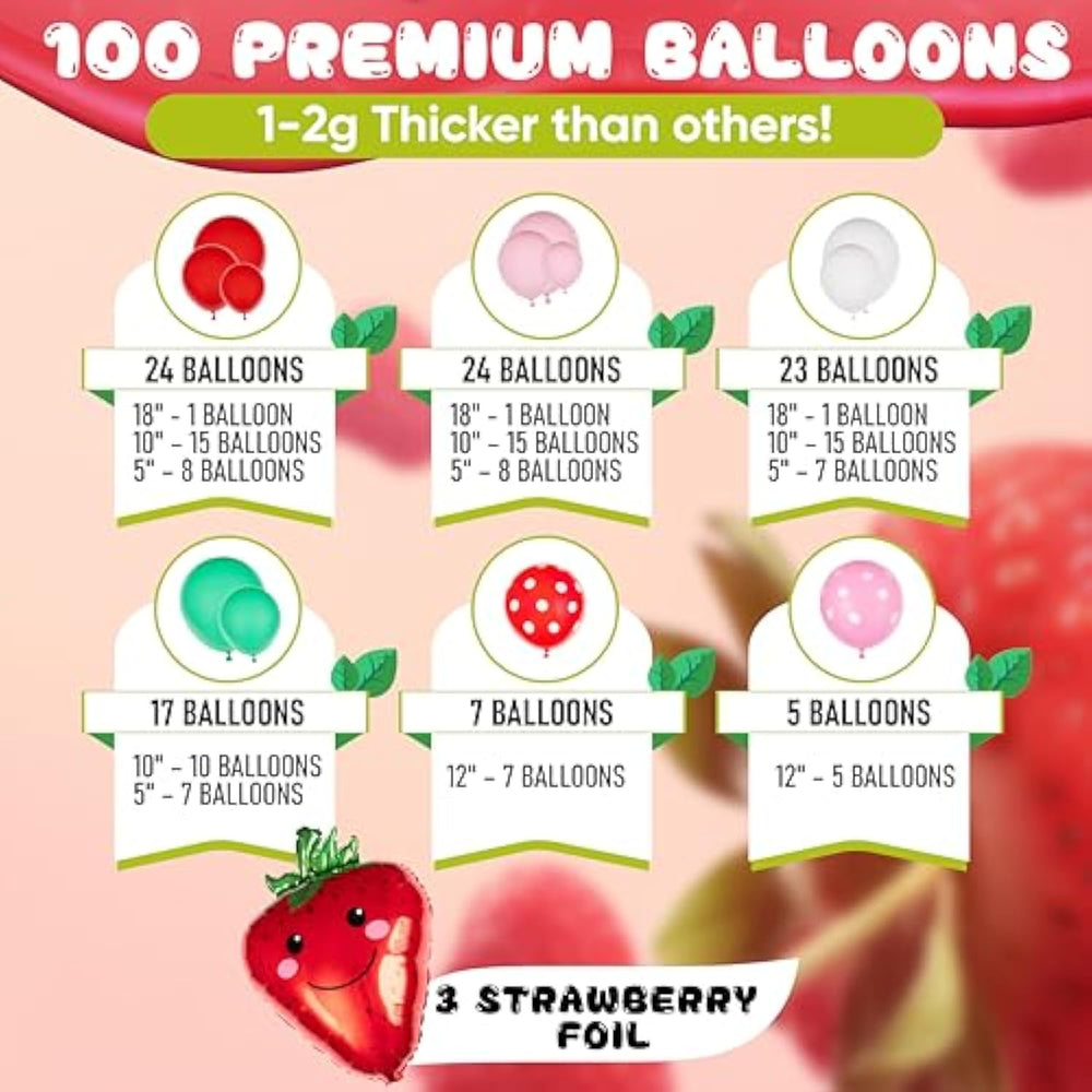 Bring your party to life with this all-in-one strawberry balloon garland kit, designed to make decorating for your strawberry-themed event a breeze. Whether it's a strawberry baby shower or a Strawberry Shortcake birthday party, this kit includes everything you need to create a stunning balloon arch. It features 100 balloons in vibrant shades of red, green, white, and pink, along with accessories like glue dots, a 16ft balloon garland strip, and a 32ft tying ribbon to securely hang the garland or individual balloons. Plus, you'll receive step-by-step video instructions, making it incredibly easy—even for first-timers—to assemble the garland. Crafted from high-quality materials, these balloons are thick, durable, and vibrant, ensuring they last throughout your entire celebration without popping or deflating. No need to hire a professional when you can create a jaw-dropping setup at home. The kit also includes a bonus assortment of small, medium, and large strawberry balloons, adding that perfect finishing touch to your berry-themed decor. Get ready for compliments galore as everyone admires your stunning creation.