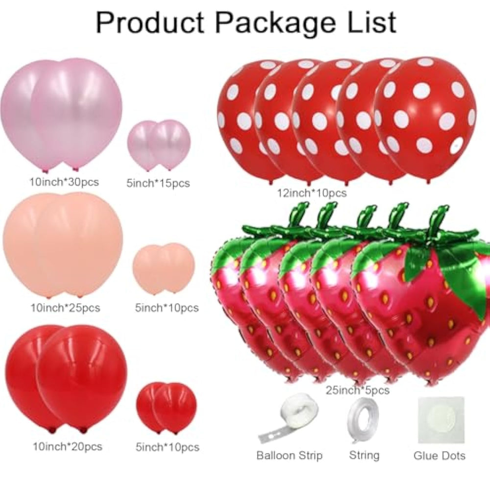 Make your celebration unforgettable with this BIG Strawberry Balloon Garland Kit, which includes everything you need for an eye-catching display. Unlike other kits, ours comes with 125 balloons in various sizes, a 5-meter balloon chain, 5 glue dots (100 points), and a ribbon, providing you with plenty of materials for a vibrant balloon arch or garland. The beautiful strawberry color scheme and different balloon sizes will create a stunning visual effect that will leave a lasting impression on your guests. Made from natural, non-toxic latex, these balloons are 10% thicker than standard ones, ensuring durability and longevity. All balloons undergo rigorous testing to ensure top-quality before delivery. Perfect for a variety of occasions including baby showers, girls' birthdays, bridal showers, weddings, family parties, engagements, and more, this kit is a simple yet impactful way to elevate any indoor or outdoor event. Whether you're using it as a photo booth backdrop or a striking party decoration, this kit will surely impress.