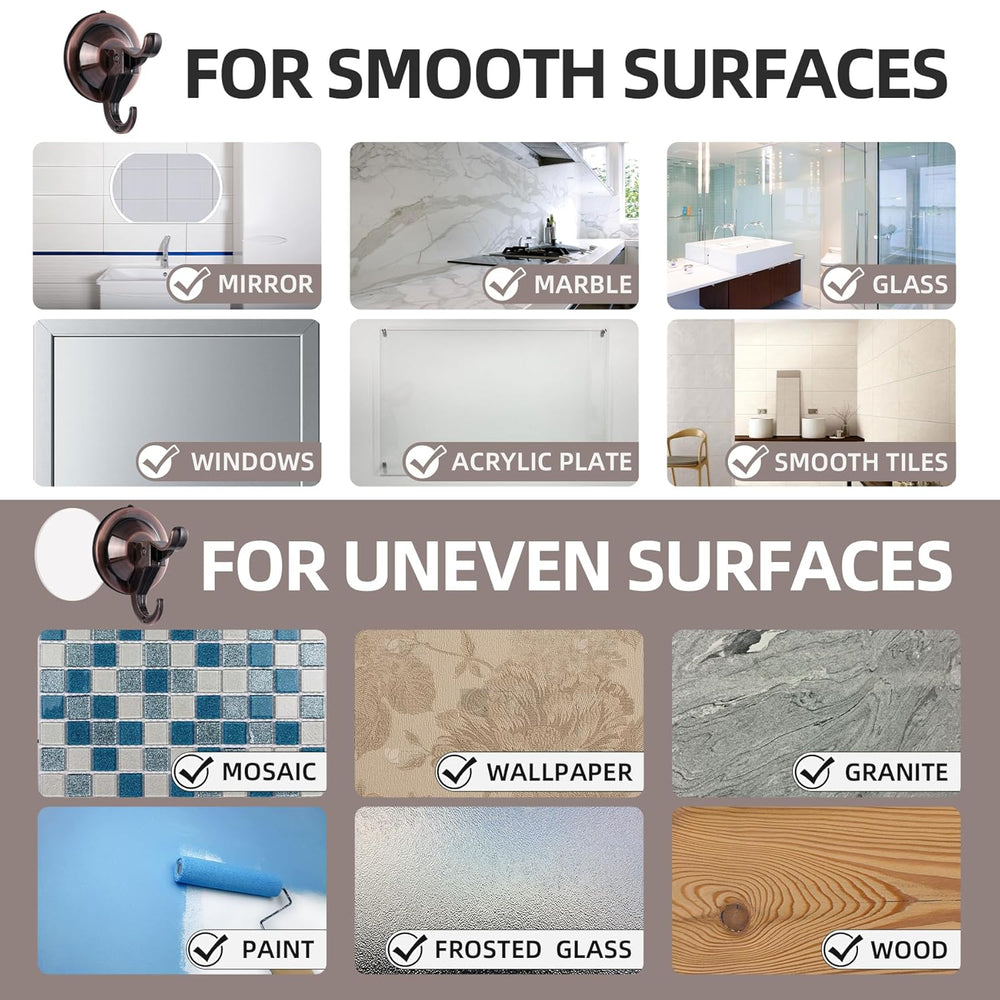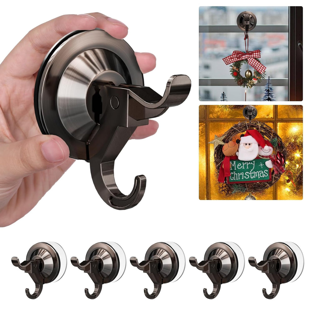 | ?Patent-Pending Dual Hooks Design?No Drills, No Nails, No Damage To Walls. Vacuum Suction Hooks Water-Resistant And Reusable. The Double Hook Is Bigger So That It Is Not Limited To Hanging Small Objects. You Will Receive 5 Suction Hooks And 5 Adhesive Discs, And Each Hanging Hook Can Hold Up To 11Lbs. | | ?Two Installation Methods?For Smooth Surfaces, Just Wipe Clean And Lock The Suction Cup Hook In. For Installation On Uneven Surfaces, You Can Install The Included Adhesive Discs (Each Is Only 3.5Mm/0.14 Inches Thick) And Then Place The Hook On Top Of It. | | ?Wide Application? Large Suction Utility Hooks Suitable For Nearly All Common Surfaces, Like Windows, Mirrors, Glass, Ceramics, Wood, Wallpaper, Marble, Porcelain, Acrylic And So On. Thanks To Its Great Suction And Excellent Adhesion, The Hooks Can Meet Your Different Needs To Organize Bathroom, Bathtub, Kitchen, Fridge, Sink. | | ?Reusable Removable?Measuring 3.5 X 2.7 X 1.7 Inches, Delicate But Strong, The Red Copper Suction Cup Hooks Can Add Great Aesthetics To Your Home Decor. The Hooks Are Designed To Be Removable And Reusable For Your Replacement. Simply Release The Suction Cup Without Any Trace. Reuse Them For Better Arrangement. | | ?Durable Stable?No Rust, No Deformed, No Yellow. The High-Quality Hard Plastic And Brushed Surface Give The Holders Great Durability And Stability. The Suction Cup Hook Is Anti-Hot-Water Max 158°F, Keeping Stable When Showering Hot Water. You Can Use It To Hanging Bath Sponge, Towel, Robe, Brush, Clothes And More.Can Also Be Used On Outdoor Glass Windows Christmas Wreath Hanger. | |