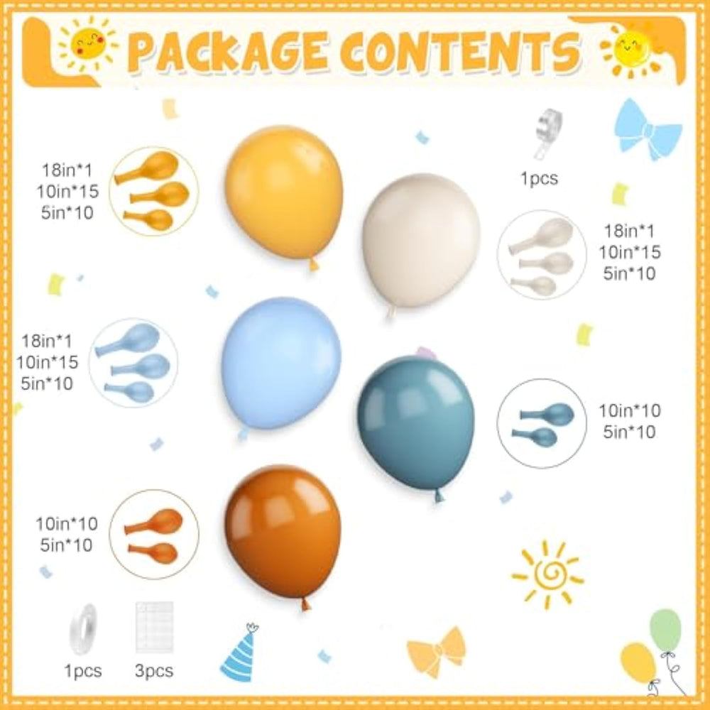 This Sun Theme Balloon Arch Kit comes with a generous assortment of balloons: 3 pcs 18-inch Lemon Yellow, Baby Blue, and Sand White balloons; 65 pcs 10-inch balloons in Lemon Yellow, Dusty Blue, Baby Blue, Sand White, and Retro Coffee; and 50 pcs 5-inch balloons in the same colors, along with balloon arch strips, glue points, and ribbon for easy assembly. Made from 100% natural biodegradable latex and durable aluminum foil, these balloons are thick, long-lasting, non-toxic, and safe for children, offering plump colors that resist bursting and support all-day celebrations. Perfect for baby showers, gender reveal parties, sun-themed birthdays, sunflower weddings, bridal showers, bee-themed parties, children’s day, anniversaries, and more, this kit adds layered, eye-catching decoration to any event. The balloons are easy to inflate with air or helium, and the included strips allow you to quickly create a stunning arch or garland in about 30 minutes, making DIY assembly fun and interactive with family and friends.