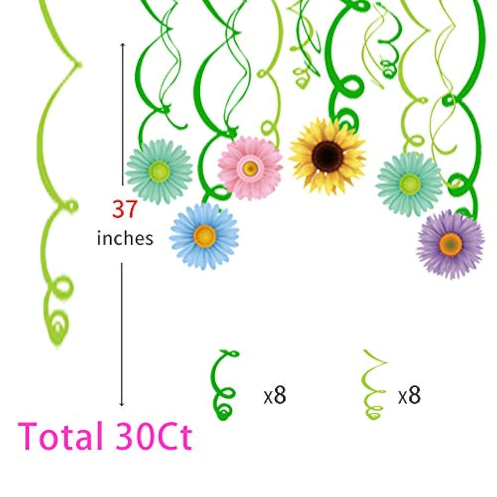 Brighten up your celebration with this 30-count set of Sunflower Hanging Swirl Decorations—perfect for spring and summer parties. Featuring cheerful sunflower designs, these swirls are made from high-quality plastic foil and paper, making them durable and reusable for multiple occasions. Easy to hang with attached plastic loops, they're ideal for ceilings, windows, doorways, trees, and more. Perfect for birthdays, baby showers, picnics, weddings, and classroom or home décor, these vibrant decorations add a joyful, sunny touch to any event.
