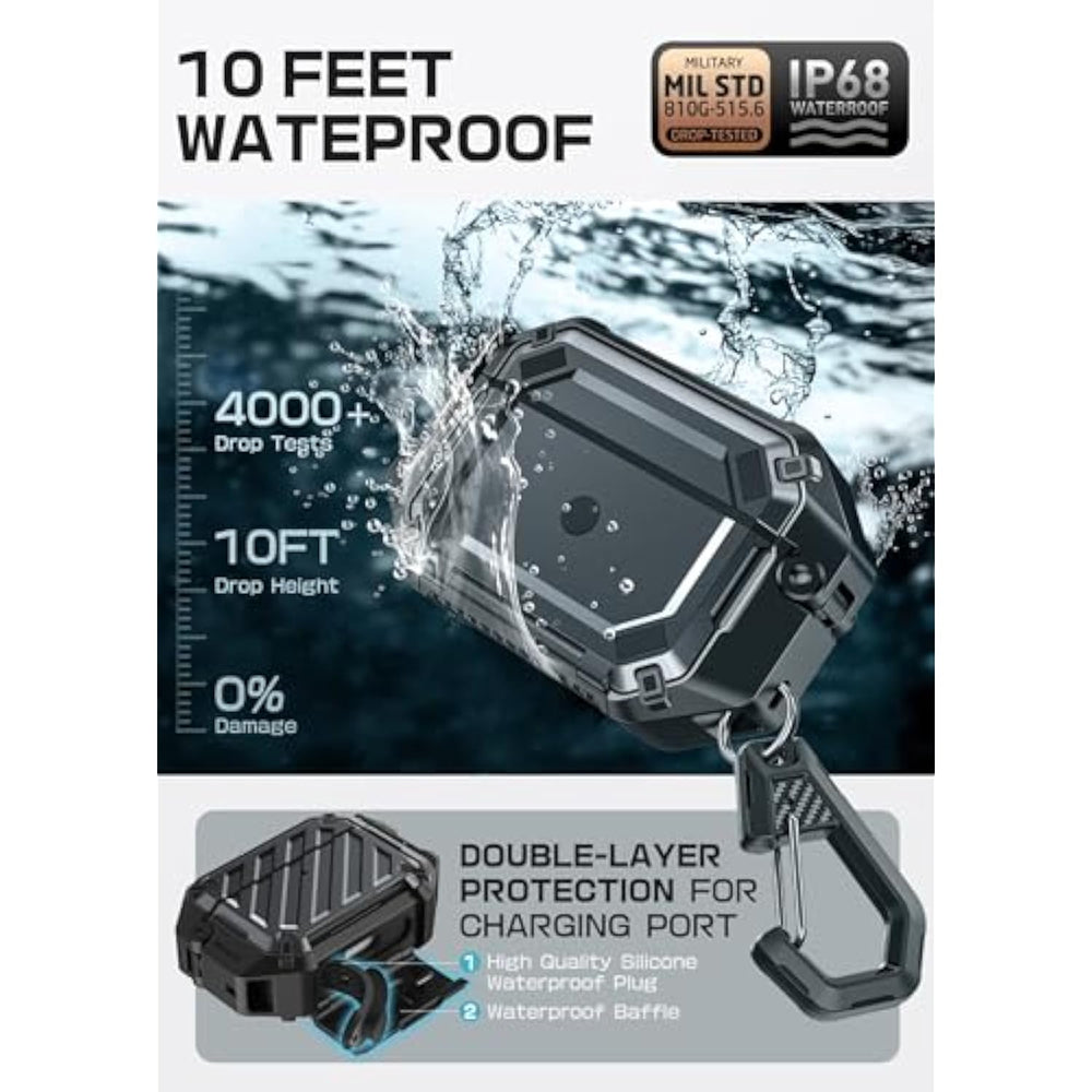 | Compatible with AirPods Pro 2nd/1st generation (2023/2022/2019 release). Please Note: AirPods and Charging device are NOT included. | | Precise cutouts provide easy access to your USB cable port and front LED is visible while charging. | | Carabiner Design protects your AirPods from getting lost, just clip to your belt loop or backpack and go. | | Double locks design in the charge port and the connection armors your airpods adhering to IP68 waterproof level of 10 feet. | | Solid hard-shell TPU and PC materials provide military grade protection against drops and falls. Extra internal soft rubber cover guard your airpods from wear and tear. | |
