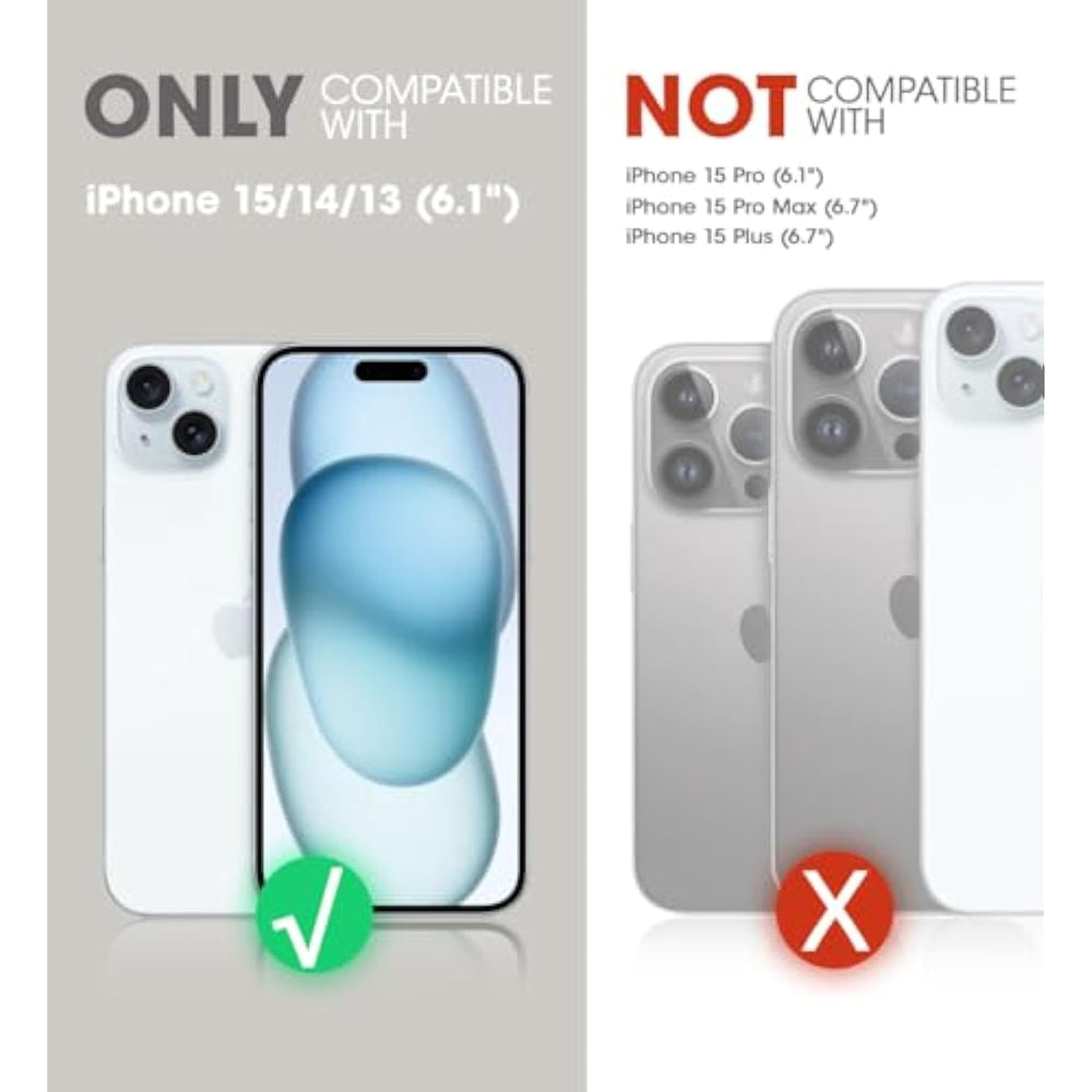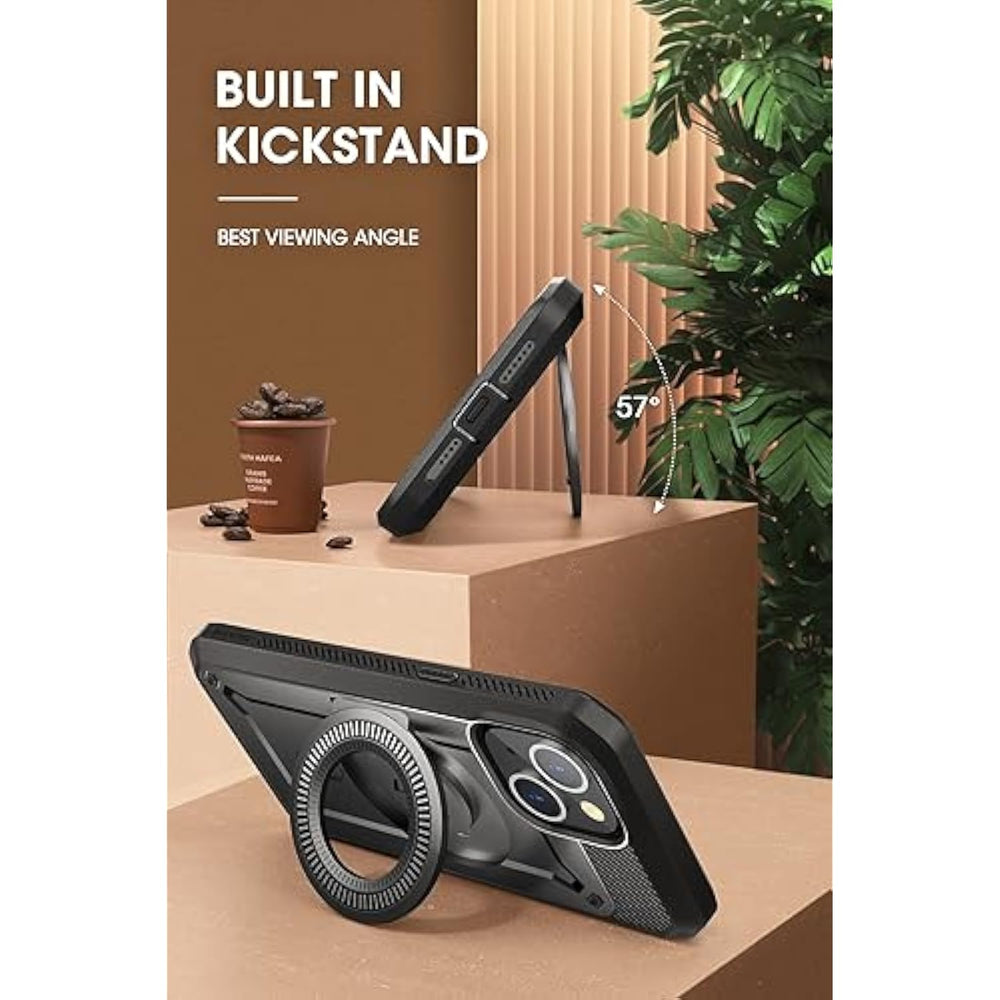 | [Compatible with MagSafe]: Compatible with MagSafe and Most Other Wireless Chargers. It also works with MagSafe car mount to make navigation more convenient while driving. | | [Built-in screen protector]: Built-in screen protector prevents scratches without compromising touch sensitivity. | | [Rotatable Belt-Clip]: Detachable swiveling belt clip for convenient, hands-free, pocket-free carrying. | | [Kickstand Feature]: Built-in Kickstand provides the best viewing angle. | | [Compatibility]: Compatible with iPhone 15 / iPhone 14 / iPhone 13 6.1 inch. | |