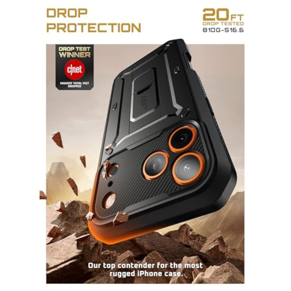 | Engineered for Ultimate Defense: Survives drops up to 20 ft (6 m) with military-grade impact resistance (MIL-STD-810H-516.6 certified). Built with a hybrid TPU + PC frame, reinforced corner airbags, and a PET built-in screen protector. Precision-raised edges (1.5 mm camera lip, 2 mm screen lip) and an ultra-slim ~3.94 mm back profile keep your device safe. Includes an additional TPU guard designed to protect the iPhone 17 Pro Max camera array. | | Experience the