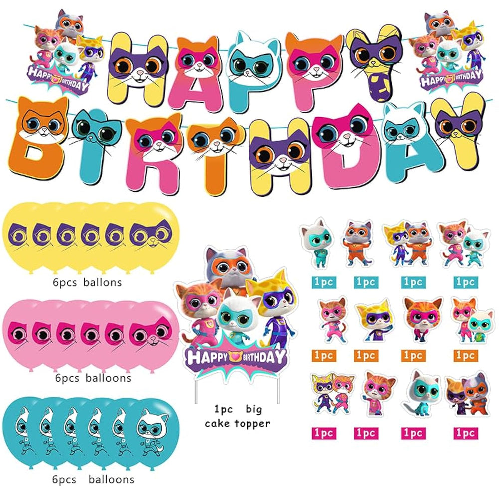 | What You Get: Package Includes 1 Set Of Happy Birthday Banner, 18 Pieces Of Latex Balloons(3 Design), 1 Pieces Of Big Cake Topper, 12 Pieces Of Cupcake Toppers(12 Styles). All Of Them Package In A Opp Bag. | | High-Quality : All Our Product Accessories Are Made Of High-Quality Materials. The Balloons Are Made Of Safe And Environmentally Friendly Latex Respectively, Durable, Stored After Deflating, And Reusable; And The Cake Decoration Is Made Of Thick Cardboard, Beautiful And Durable! | | Best Gift For Your Kids: This Super Cats Theme Birthday Party Supplies For Most Children, Designed For Fans, Whether It'S For Birthdays, This Is The Perfect Choice For Kids, And It'S Also The Perfect Gift For Your Classmates. | | Unique Design: The Cake Topper Is Delicately Crafted It Will Make Your Cake Decorations More Creative, And Perfect For Kids Birthday Party. Easy To Assemble, No Time Consuming, Enjoy The Fun With Your Kids. | | After-Sales Service: We Want To Offer You Premium Products For A Long-Lasting Experience. | |