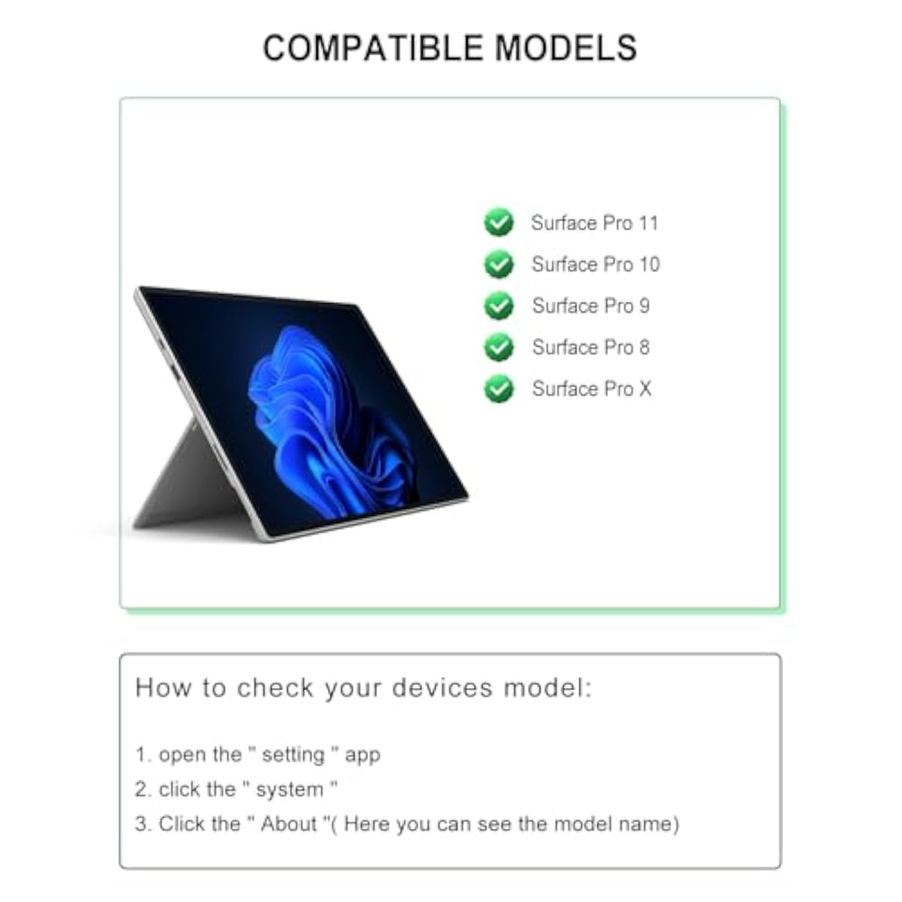 | Compatibility : Specially Designed For Surface Pro 8, Pro 9, Pro 10, Pro 11, And Surface Pro X (1St Gen/2Nd Gen/3Rd Gen), Our Surface Pro Keyboard Connects Seamlessly Via Bluetooth, Transforming Your Surface Device Into A Laptop-Like Experience Anywhere You Go.(Please Check Your Model Before Purchg) | | 7-Color Backlight Long Battery Life : 7 Vibrant Backlit Colors With 3 Brightness Levels For Choose, Ensuring Visibility And Comfort In Low-Light Environments. The Built-In 750Mah Rechargeable Battery Provides Up To 180 Hours Of Usage Without Backlight. Our Surface Pro 13 Inch Keyboard Enters Sleep Mode After 15 Minutes Of Inactivity, Standby Time Of Up To 100 Days | | Detachable Wireless Bluetooth Keyboard : Our Surface Pro 11 Keyboard Connects Wirelessly Up To 33Ft (10M) Away Via Bluetooth. Enjoy The Flexibility Of Using The Surface Pro Type Cover Keyboard Separately From Your Surface Pro Device, Ideal For Watching Movies Or Working From A Distance Without Worrying About Battery Drain From Your Tablet | | Instant Bluetooth Connection : Experience Hassle-Free Connectivity—Once Paired, The Surface Pro 9 Keyboard Will Automati