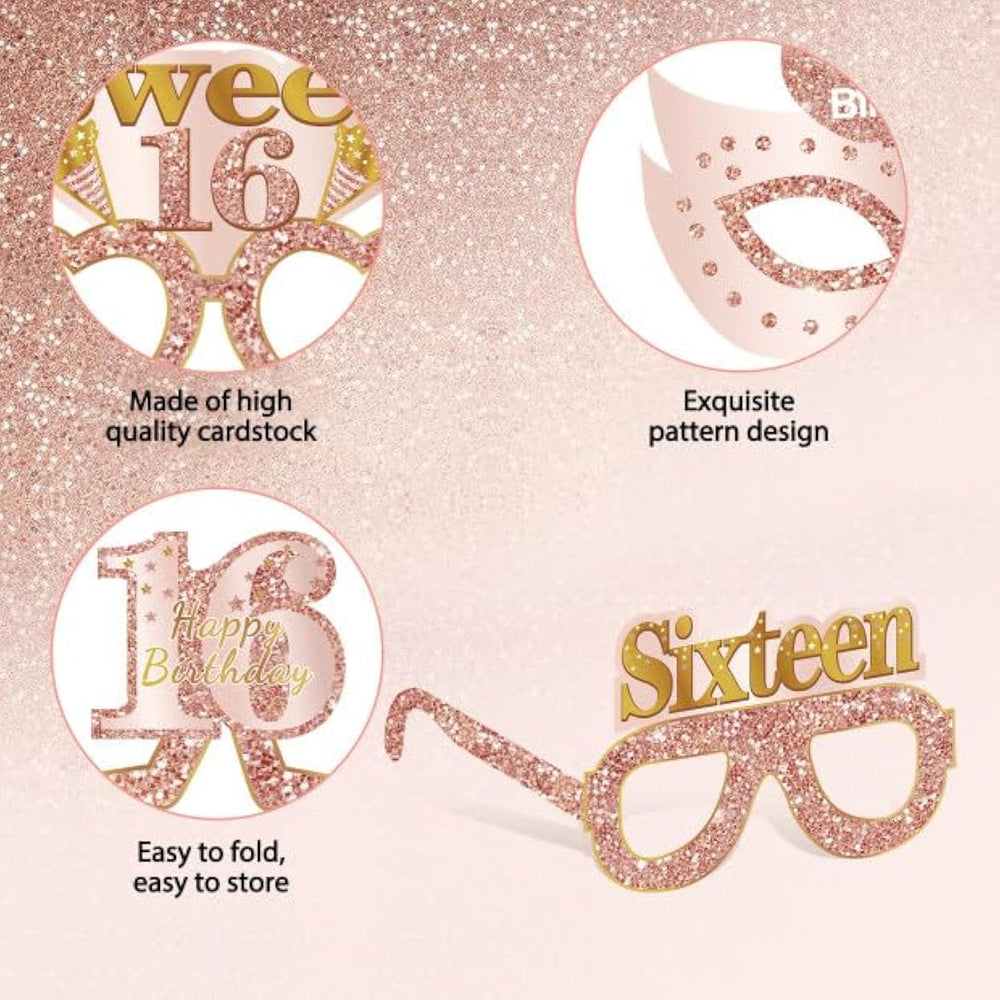 Add fun and flair to any Sweet 16 celebration with this 24-piece set of paper eyeglasses! Featuring 12 unique designs in pink and rose gold with festive elements like fireworks, hearts, stars, and “Sweet 16” messages, these glasses are perfect photo props and party accessories. No assembly needed—just fold and wear. Made from lightweight, reusable paper, they're easy to use, comfortable to wear, and a hit with guests of all ages at any 16th birthday party.