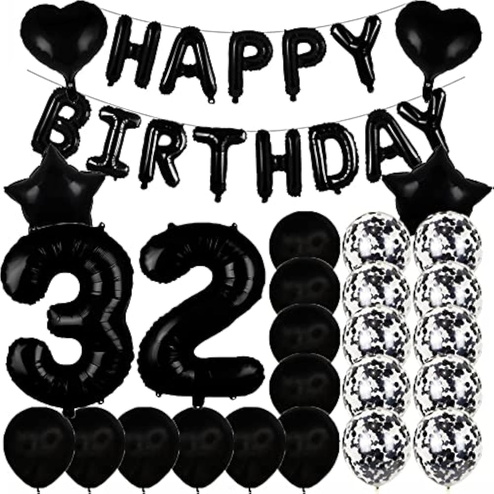 | Sweet 32Th Birthday Decorations : Happy Birthday! Congratulations On Your Arriving Birthday!These Large Number 32 Black Balloons Bundle Will Complete Your Colorful Birthday Party Supplies | | Sweet 32Th Party Supplies:32Th Birthday Decorations With Confetti Balloons Can Be Reused Several Times And Easliy Deocrate, Birthday Set Is Perfect For 32Th Birthday Celebration. Mylar Balloons Have Self-Sealing Valve For Easy Inflation And Deflation. It Is Meant To Be Reused | | Number 32 Balloons :These Party Supplies Balloons Are Great Pretty In Color And They Are Hard To Burst With The Premium Material ,Stay Afloat For Long . The Beautiful 32Th Birthday Balloons Set | | Inflation Instructions: Inflate With Helium Or Air. Wipe The Inflated Balloon With Paper, Wool, Or Carpet So That The Confetti Can Hold The Balloon Tightly.If You Use Air, They Will Not Float(Please Use High Quality Helium To Fill Your Confetti Balloons) | | Package Includes: 40 Inch Black Foil Balloons "32" Set, 16 Inch "Happy Birthday" Banner Balloons,2Pcs 18 Inch Mylar Loving Heart Balloons,2Pcs 18 Inch Mylar Star Balloons,10 Pcs Confetti Balloons And 10Pcs Black Latex Balloon | |