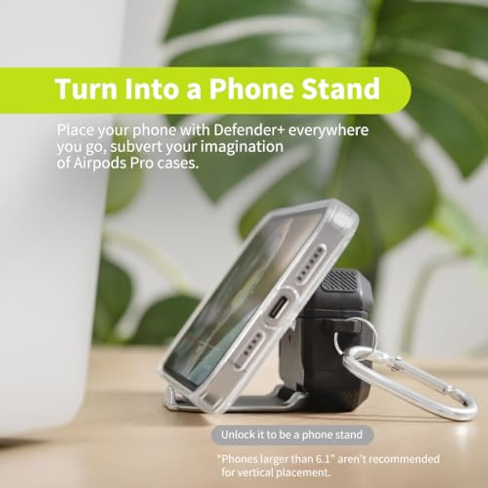 | Rugged Protection Robust Defense - SwitchEasy AirPods pro 2nd generation case with lock is crafted with high-quality shock-absorbing TPU layers to prevent against drops, bumps, and scratches, keeping your AirPods Pro safe and secure at all times. | | No Worries about AirPods Falling Out! - Featuring an unique integrated phone stand and innovative lock function, it securely encloses your AirPods, preventing accidental opening or detachment of the upper case whether in your pocket, bag, or hands. | | Turn Into a Phone Stand - Unlock it to transform into a durable and sturdy phone stand that allows you to place your phone (phones with a size of 6.1" or above cannot be placed verti