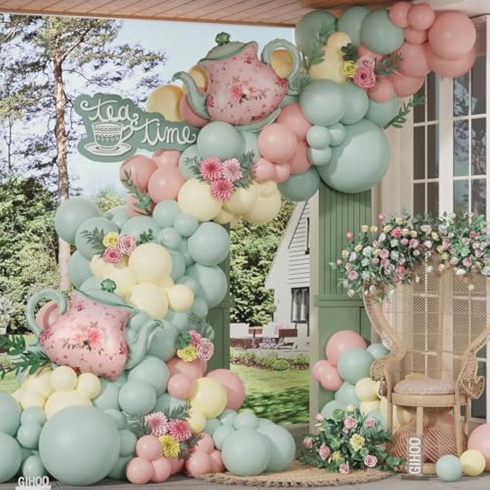 | Tea Party Decorations :The Pastel Pink Green Teapot Balloon Arch Kit Is Perfect For Tea Party Birthday ,Spring Party,Bridal Shower ,Mother'S Day,Tea For Two Party Decorations,Lets Partea ,Tea Party Bridal Shower Decorations,Tea Party Baby Shower Decorations,Moand Any Other Tea Themed Party Decorations. Whether You'Re Hosting A Large Party Or A Small Gathering, This Value Pack Has Got You Covered- No Need To Break The Bank On Individual Decorations | | Premium Value Pack: You Will Receive 137 Pink Green Yellow Colors Pastel Latex Balloons And 2Pcs Teapot Mylar Foil Balloons .The Tea Party Balloon Arch Kit Also Contains One Balloon Arch And One Role Balloon Dot Glue(More Packing Details Show In The Package Picture) | | Unforgettable Tea Party Birthday Decorations:Pink And Green Teapot Balloon Arch Kit Helps You Match The Rich Balloons Colors! It Will Provide You With Plenty Of Creative Space. Come And Diy The Unique Tea Theme Party With Your Friends | | Easy To Assemble:Just Enjoy The Fun With The Tea Party Decoration Balloon Arch Kit. The Teapot Balloon Garland Arch Kit Comes With Everything You Need, No Prior Experience Or Special Skills Required! To Create A Stunning Centerpiece For Your Tea Party Theme Celebration. It Is Easy To Inflate, You Can Hang It Over The Trees, Walls, Windows, Doorways, Dinner Tables And Any Place You Like | | Warm Tips:Can'T Float Even If You Fill Them With Helium! Please Inflate All Balloon By 85% Or Pop Out Easily. It Is Hard For Balloon Will Retain Their Shine When The Sun Is Beaming On Them. If They Are In The Shade They Will Stay Shiny In Short Time | |