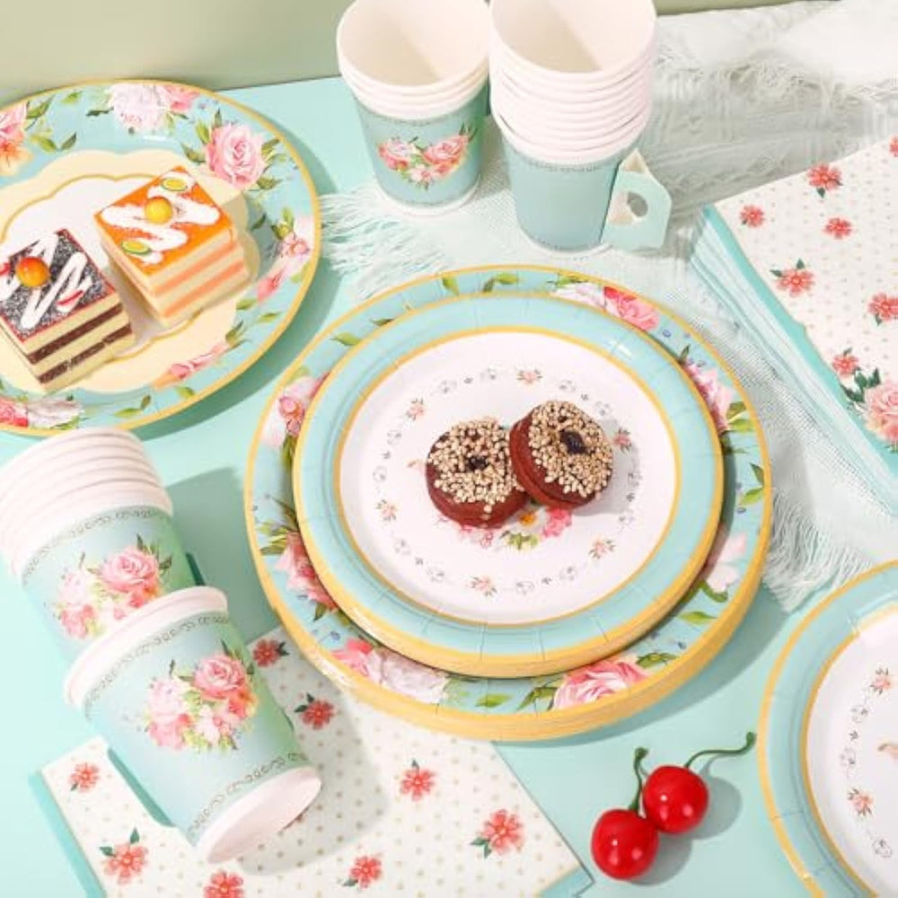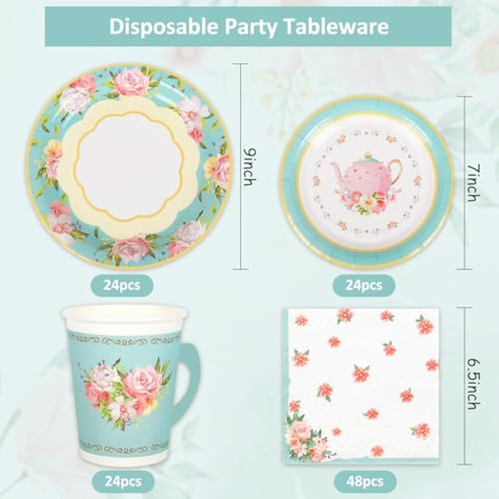 | Tableware Set - Includes 48Pcs Paper Plates, 48Pcs Napkins, 24Pcs Cups With Handles, Sufficient Quantity And Exquisite Design Are Great For Table Decoration. | | Tea Party Theme - Our Plates, Napkins And Cups All Match Tea Party Theme, Mainly In Pink And Green, Printed With Tea Pot, Flowers, Etc., Can Make Your Table Setting More Charming. | | Safe Material - Our Tableware Set Are Made Of Paper, Disposable And Safe, Convenient For Party Use. Note: Please Don'T Put The Plates In The Microwave?The Cup Handles Are Attached With Hot Melt Adhesive. Please Do Not Add Too Hot Water Or Drinks. | | Dimension - The Paper Plates Have 2 Sizes, 9 X 9Inch And 7 X 7Inch, Each Size 24Pcs, The Napkin 6.5 X 6.5Inch When Folded, The Capacity Of Paper Cups Are 9Oz, Perfect Serve 24 Guests. | | Wide Range Of Use - Elegant Design Make The Dinnerware Set Suitable For Afternoon Tea, Wedding, Bride Shower, Birthday Parties, Home Dinners, Etc., Can Leave Guests Deep Impressions. | |