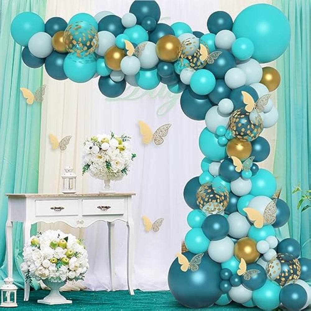 Teal Balloon Garland Kit: 148Pcs - 2Pcs 18''Teal/Pastel Diffan Blue Balloons, 5Pcs 12''Gold Confetti Balloons, 80Pcs 10''Dark Teal/Diffan Blue/Pastel Diffan Blue/Metallic Gold Balloons, 45Pcs 5''Dark Teal/Diffan Blue/Pastel Diffan Blue Balloons, 12Pcs Gold Butterfly Stickers, 4Pcs Balloon Tools(Balloon Arch Strips, Balloon Tying Tool, 100 Glue Points, Random Color Ribbon). Rich Teal Balloon Product Configuration Makes Your Diffan Blue Party Decoration Even More Unforgettable. | Wide Applications: Our Dark Teal Butterfly Balloon Garland Arch Kit Can Satisfy All Your Summer Fresh Theme Party Decoration. It Is Suitable For Wedding, Home Decoration, Bachelorette, Bear Shower, Gender Reveal, Bridal Shower, Backyard Wedding, Teal Theme Party, Wedding, Birthday And Any Celebration. Can Be Hung As Backdrop, Garland, Centerpiece, Table Runner...Anywhere You Want To Decorate! It Will Be A Perfect Teal Party Decoration Background And Make Your Party Well Received. | Premium Material: This Turquoise Balloon Garland Arch Kit Are Made Of High Quality Latex, Which Is Thick, Not Easy To Crack, Safe To Be Used By Children. These Pastel Balloons Can Be Filled With Air, Helium Or Water. The Balloon Tool Can Make The Balloon Knot Quickly, Easy To Stick Together And Form A Balloon Arch For Diffan Blue Teal Party Decorations For Any Party, Release Your Hands And Prevent Sore And Add Energy To Your Party! | Easy To Install: The Turquoise Balloons Decorations Comes With 4 Installation Tools (Balloon Arch Strip, Balloon Glue Point, Tying Tool And Ribbon), Which Can Help You Make A Balloon Arch More Easily. Just Inflate The Balloons And Tie Them With A Knotter, Insert The Balloons Into The Balloon Belt And Trim Them To The Required Length, Then Use Glue Or Ribbon To Hang The Garland Anywhere You Want To Decorate It. The Teal Party Decorations Will Add Unique Charm To Your Party! | Diffan Blue Party Decorations: Diffan Blue And Teal Balloons Are Very Popular Now. Teal And Gold Are Very Suitable For All Kinds Of Parties, And These Colors Constitute An Elegant Party Decoration With A Classic And Fashionable Appearance. Suitable For Most Occasions, Such As Birthday Parties, Bachelorette, Baby Showers, Weddings And So On. It Is Not Only Suitable For Indoor Decoration, But Also Very Amazing When Placed On The Outdoor Lawn. Make Your Decoration Eye-Catching! |