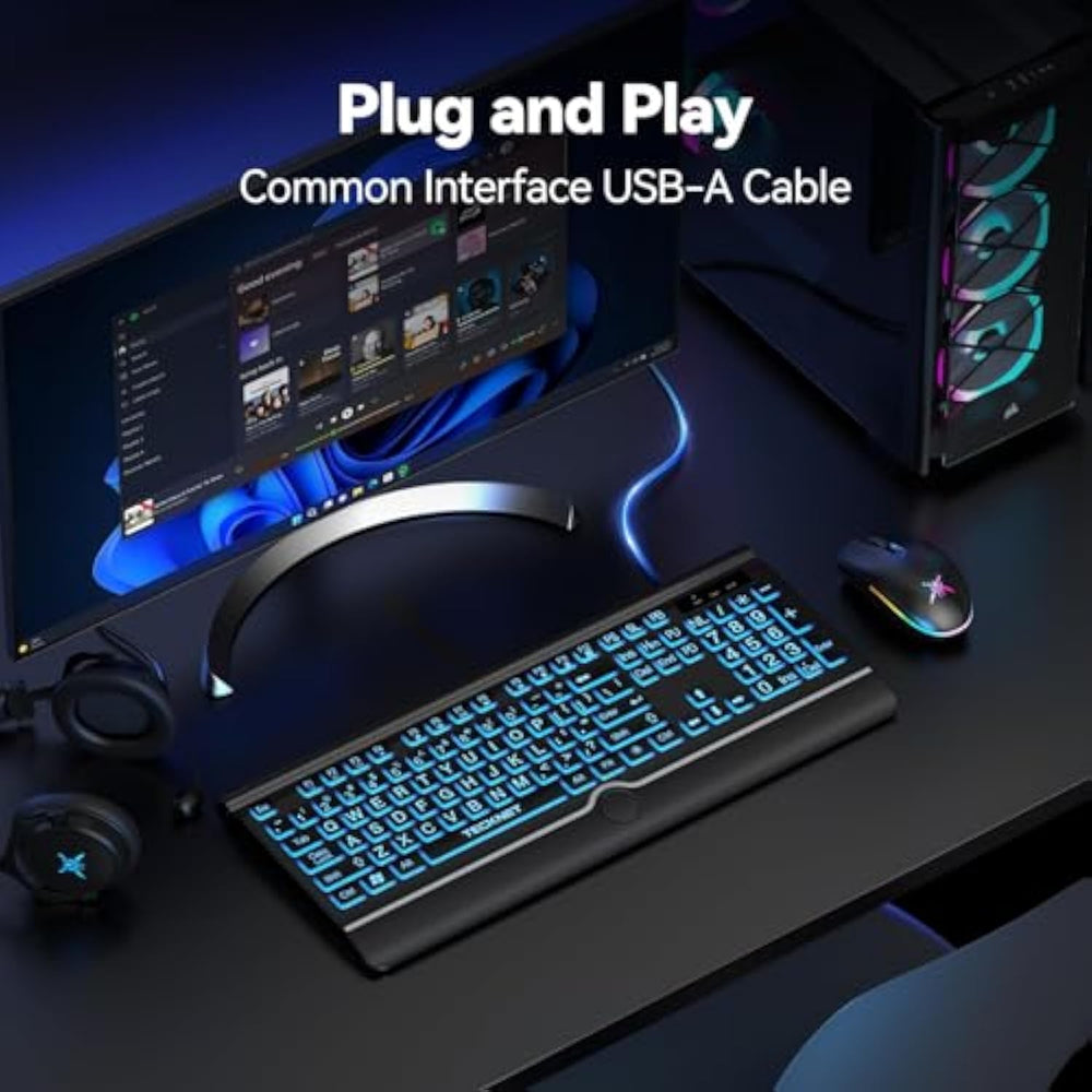 | ?Large Font Design, Easy to Read?This large print backlit keyboard features 4X enlarged characters printed on standard-sized keycaps, enhancing character clarity by 300%. It is particularly suitable for users over 40 years old, individuals undergoing vision correction, educational institutions, and corporate office environments. Whether in schools, libraries, or office settings, it reduces eye strain during prolonged typing, improving reading comfort by 78%, and providing an exceptional visual experience for users with poor eyesight | | ?7-Color Smart Backlight? The large print backlit keyboard offers 7 lighting modes with three brightness levels. You can also switch between breathing light mode and constant lighting mode to match your preference. Choose white light at medium brightness for enhanced focus during work, or use amber light at low blue light levels to protect your eyes at night. This feature personalizes your workspace while enhancing its aesthetics | | ?Ergonomic Design for Lasting Comfort?Designed with a 15° golden tilt angle, this wired backlit keyboard follows ergonomic principles and includes adjustable stands to help maintain a proper typing posture. The full-size 104-key layout features an independent numeric keypad, 3.2mm comfortable key travel, and 45g moderate actuation force for a responsive yet effortless typing experience. Additionally, the wrist rest perfectly conforms to your wrist curve, reducing hand fatigue by 63% after 4 hours of continuous use, ensuring comfort even during extended typing sessions | | ?Durable DesignLong-Lasting Performance?With a spill-resistant design, the large print keyboard provides effective protection against accidental liquid spills during daily use. The keycaps are coated with a wear-resistant layer, ensuring no fading for up to 3 years. Combined with a 50-million keystroke lifespan, this computer keyboard is built to last, making it a reliable companion for every workday | | ?Plug and Play Wide Compatibility?Equipped with a standard USB 2.0 interface, the large print backlit USB keyboard requires no charging or battery replacement—just plug and play. It is fully compatible with Windows 2000/XP/7/8/10/11, Vista, Raspberry Pi 3/4, and Mac OS (Note: Multimedia keys may not be fully compatible with Mac systems). Suitable for desktops, laptops, and all-in-one computers, this silent keyboard ensures a seamless and efficient work experience | |