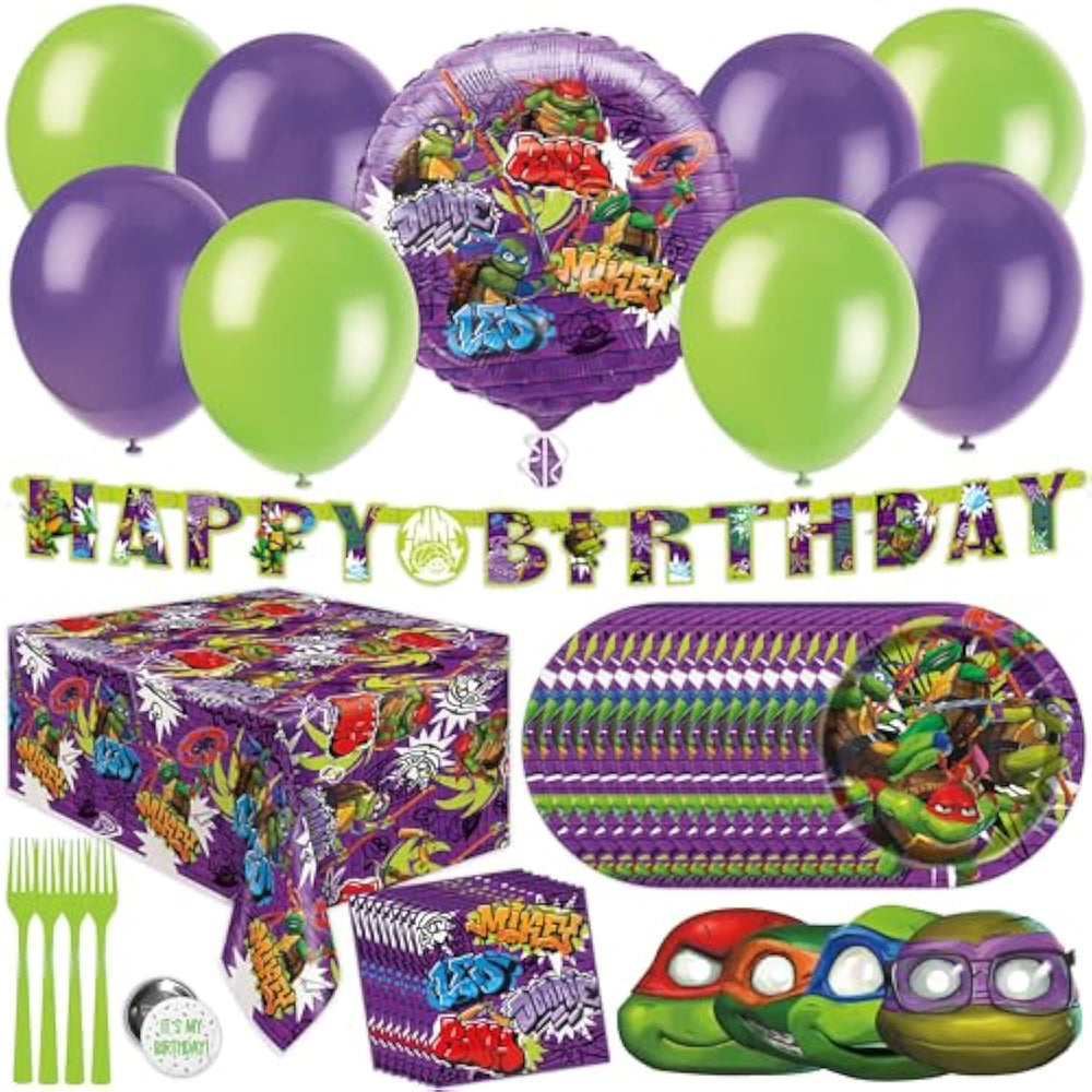 | JOIN Leonardo, Raphael, Donatello, and Michaelangelo in throwing your child a fun birthday party with this set of Ninja Turtle birthday party supplies! | | INCLUDES: This set includes enough Teenage Mutant Ninja Turtles party supplies to host a party of 16 guests: 1 table cover, 1 Happy Birthday banner, 1 foil balloon, 20 latex balloons, 16 9" paper plates, 16 paper napkins, 16 turtle masks, 18 forks and 1 It's My Birthday! button. | | DECORATIONS: The Happy Birthday banner is a great way to add a decorative pop. Suspend it over the gift table, or use it to give a little extra flash to the seat of honor. The leakproof tablecloth measures 54" x 84". Latex and foil balloons add the finishing touch! | | TABLEWARE: All plates and napkins are made from high quality heavy duty paper. They're sturdy enough to be used without a table, so guests can mingle as they eat. | | OFFICIALLY LICENSED: This TMNT party supplies set is part of Unique's Officially Licensed TMNT Mutant Mayhem movie collection. Additional items such as Ninja Turtle party favors, table covers and decorations are also available. | |