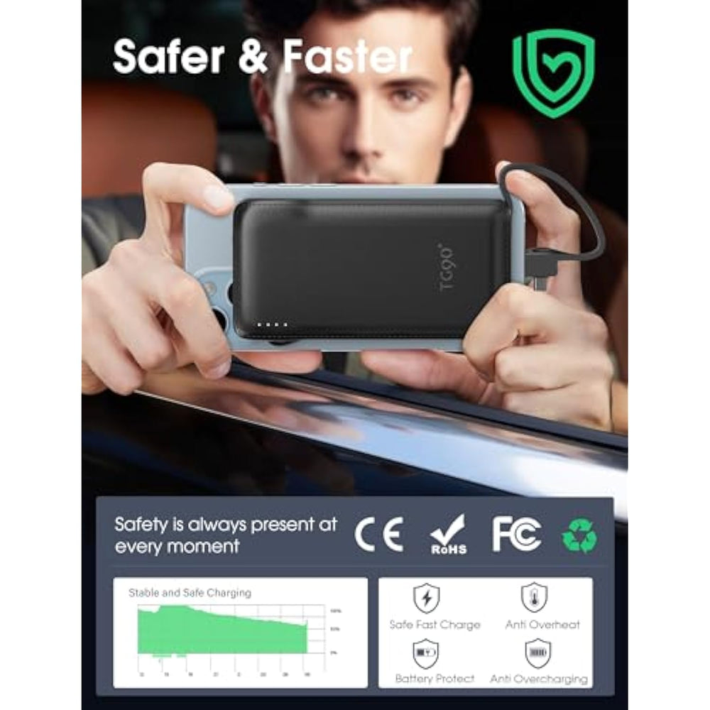 Portable Charger With Built-In Ac Wall Plug:The Built-In Ac Plug Allows It To Be Connected With A Wall Outlet, And Then Power Itself Directly From The Socket. No Longer Need To Combine With Other Adapters And Cables. | | Power Bank With Built-In Cables: All-In-One Portable Cell Phone Charger Not Only Has An Ac Plug, But Also Has Two Charging Cables. No More Worrying About Forgetting To Bring Extra Cords. Great Travel Accessories For A Trip. | | Ultra Slim But Powerful?The Battery Charger Is Designed To Be Just 0.69 Inches Thick, Thin Enough To Slip Easily Into Your Wallet Or Pocket. Besides, 10000Mah High Capacity Can Charge Your Phone 2-3Times, Leaving You In Full-Power All Day. | | Universal Compatibility: There Are 2Ports And 2Cables Built-In Battery Pack, Widely Compatible With Iphone15/14/13/15Pro/14Pro/15Pro Max, Etc, And Most Android Phones. | | What Will You Get:1 * 10000Mah Portable Charger, 1 * Usb C Charging Cable, Worry-Free 12-Month And Friendly