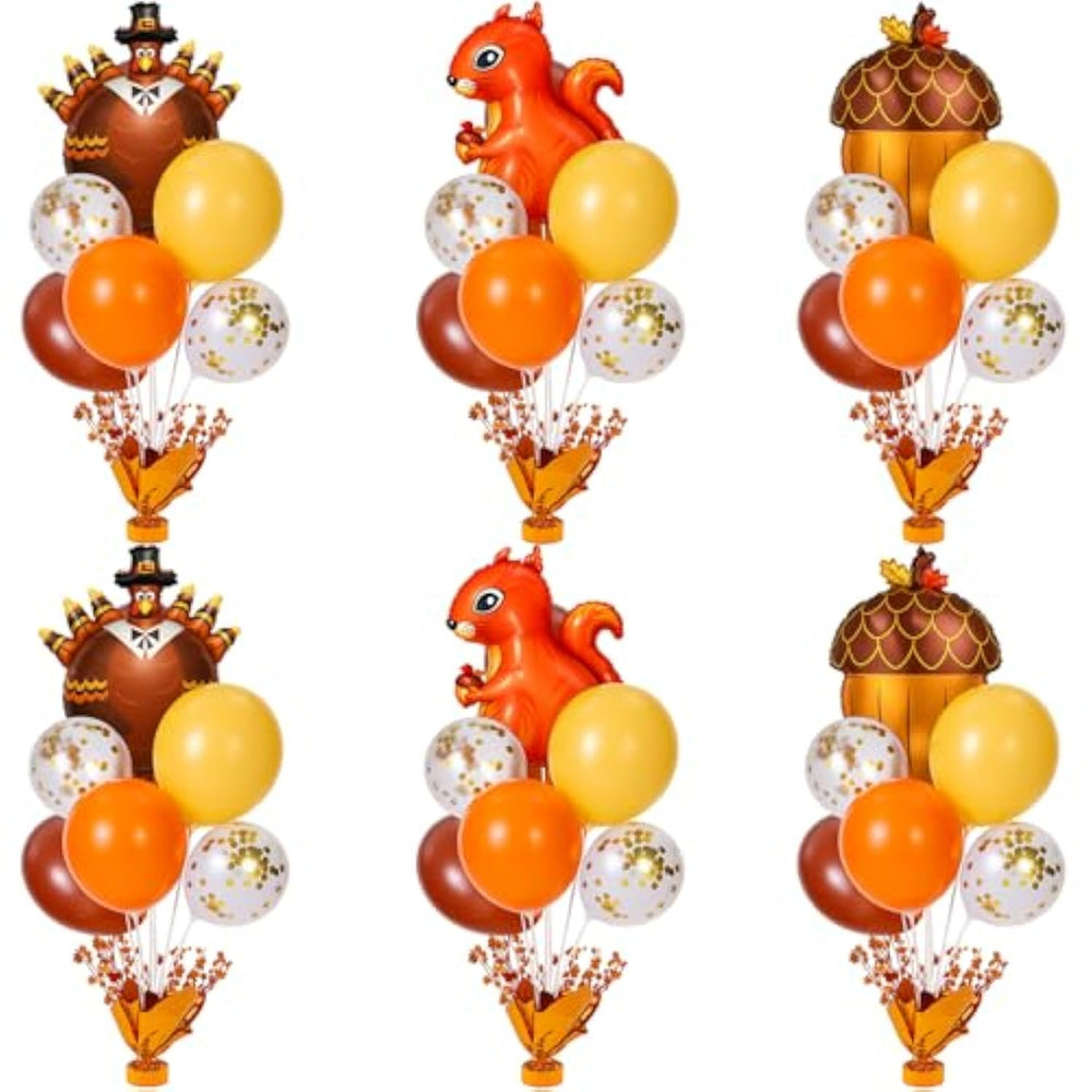 This Thanksgiving balloon centerpiece set includes 6 reusable balloon holders, 6 gold foil star spray bases, 36 latex balloons, and 8 foil balloons. The stands reach up to 40 inches, creating a festive atmosphere, and the sturdy star bases are reusable for various occasions. Easy to assemble, the sticks connect with a connector, balloons are tied to cups, and the cups attach to the stands, allowing adjustable height and style. Featuring gold and orange colors with Thanksgiving-themed designs like turkeys, squirrels, and pine cones, these centerpieces are perfect for Thanksgiving, harvest celebrations, birthdays, weddings, and baby showers.