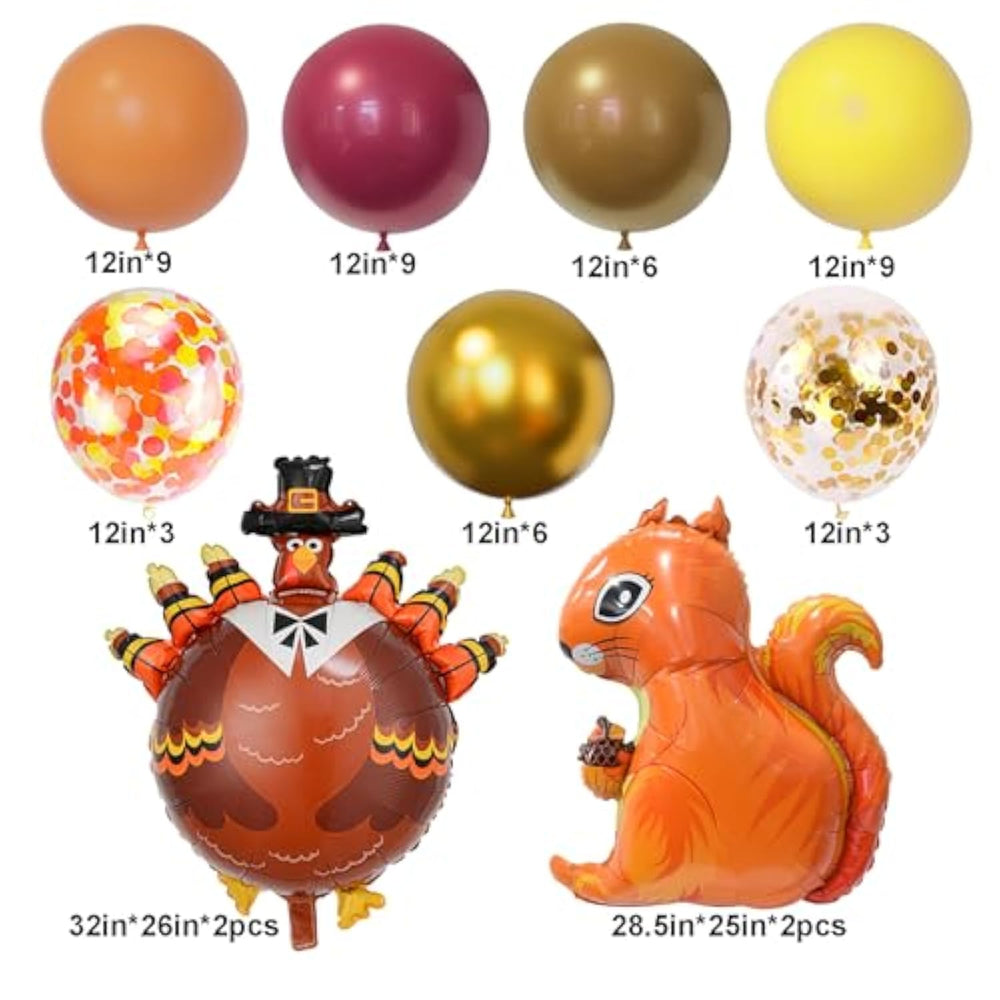 This Fall Thanksgiving Party Balloon Kit is perfect for adding festive charm to any autumn celebration. It includes 12 themed foil balloons (turkey, maple leaf, pine cone, pumpkin, leaf, and squirrel), 39×12-inch latex balloons in orange, yellow, burgundy, gold, and coffee brown, 3 gold confetti balloons, 3 orange/yellow confetti balloons, 100 glue dots, and 2 ribbons for easy assembly. Crafted from premium latex and aluminum foil, the balloons are durable, vibrant, and safe, with self-sealing valves for simple inflation. Ideal for Thanksgiving, harvest parties, friendsgiving, fall-themed birthdays, baby showers, or little pumpkin celebrations, this kit lets you create beautiful balloon garlands, arches, or decorations on walls, tables, windows, or trees to enhance your festive atmosphere.