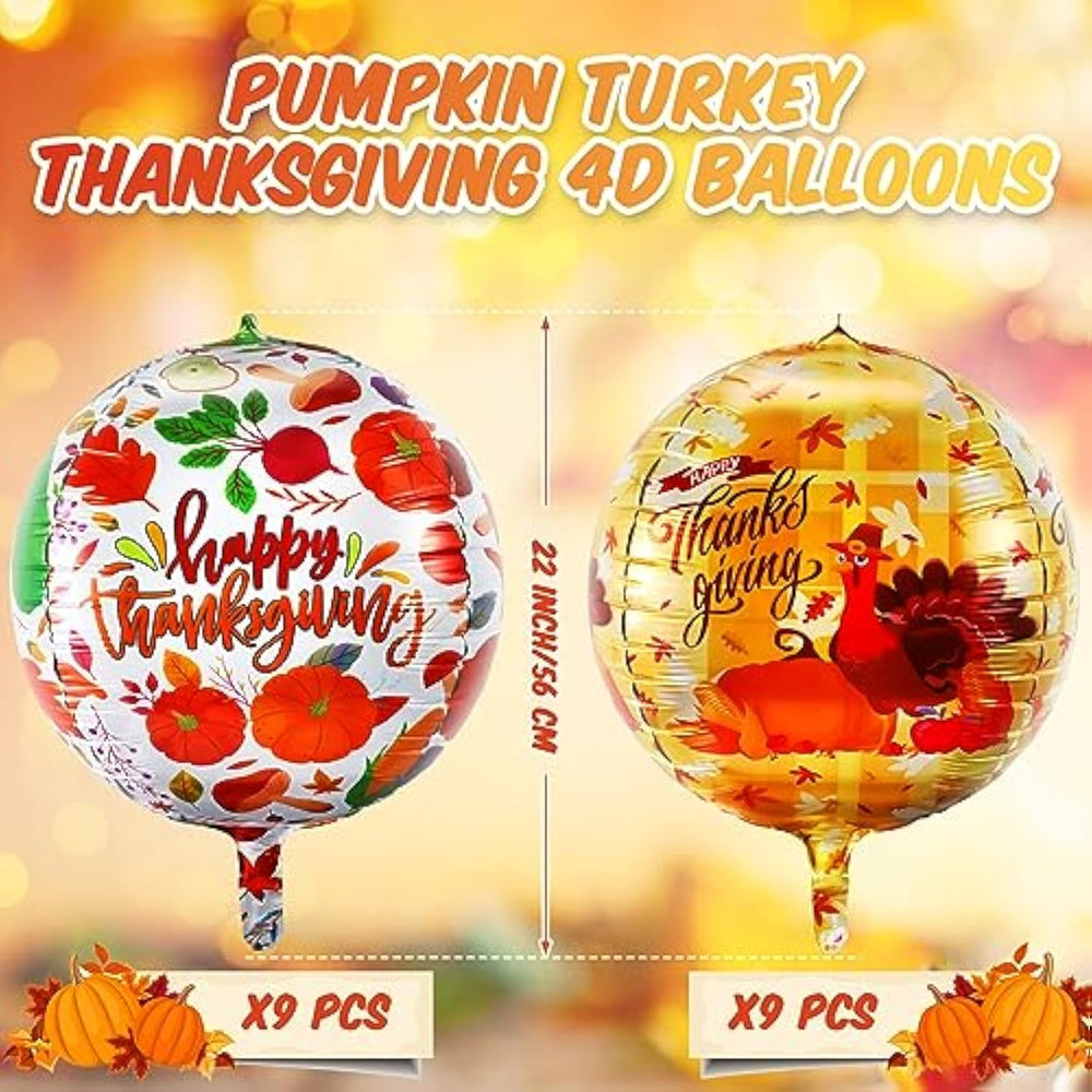 This set includes 18 Thanksgiving mylar balloons in two designs—9 maple leaf pumpkin balloons and 9 turkey balloons, each about 22 inches—perfect for festive seasonal décor. Made from durable, reusable aluminum foil, they resist bursting and can be filled with air or helium. Easy to inflate, self-sealing, and long-lasting, these balloons can be displayed on doors, ceilings, or with ribbons for creative arrangements. Ideal for Thanksgiving, birthdays, fall parties, harvest celebrations, or home and office décor, they add a cheerful and festive touch to any occasion.