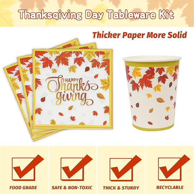 Celebrate Thanksgiving with ease using this 350-piece disposable dinnerware set, perfect for serving up to 50 guests. The set includes 50 nine-inch dinner plates, 50 seven-inch dessert plates, 50 nine-ounce cups, 50 napkins, and 50 each of knives, forks, and spoons, ensuring you have everything needed for a complete festive meal. Designed with autumn-inspired elements like maple leaves, pumpkins, and golden accents, it brings warmth and seasonal charm to your table. Made from food-grade, eco-friendly paper, the plates and cups are sturdy and reliable, while the napkins are soft and absorbent. Enjoy a beautiful Thanksgiving celebration with convenient cleanup and more time to spend with loved ones.