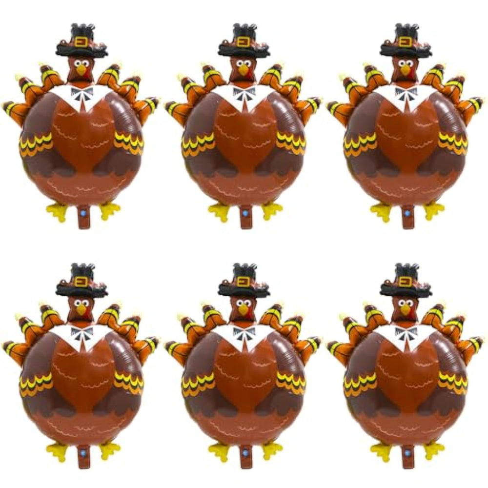 This set includes 6 Thanksgiving turkey foil balloons, each approximately 32.1" x 26" uninflated and about 26.5" when inflated, printed on both sides and made thicker for durability. The self-sealing balloons are reusable, easy to inflate with air or helium, and can be deflated for future use. Each set comes with a 32.8-ft ribbon for hanging, floating, or attaching to walls and backdrops. Ideal for Thanksgiving, fall harvest parties, birthdays, autumn celebrations, and other festive events, these balloons add a cheerful seasonal touch and can be combined with other decorations for creative displays.