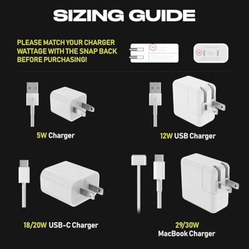 | Wind your 20W charging brick in seconds and keep it clean and organized | | Features durable TPU construction designed for easy winding and storage, and allows the user to adjust the length of the cable to desired distance | | Holds cables up to 6 feet in length | | Utilizes a patent-pending "snotch" design to clip in and hold your cables in place when you shove it in your bag or throw it on your desk | | The Snap Back 20W/18W is compatible with the Apple 20/18 Watt charging brick. See compatibility for more information | |