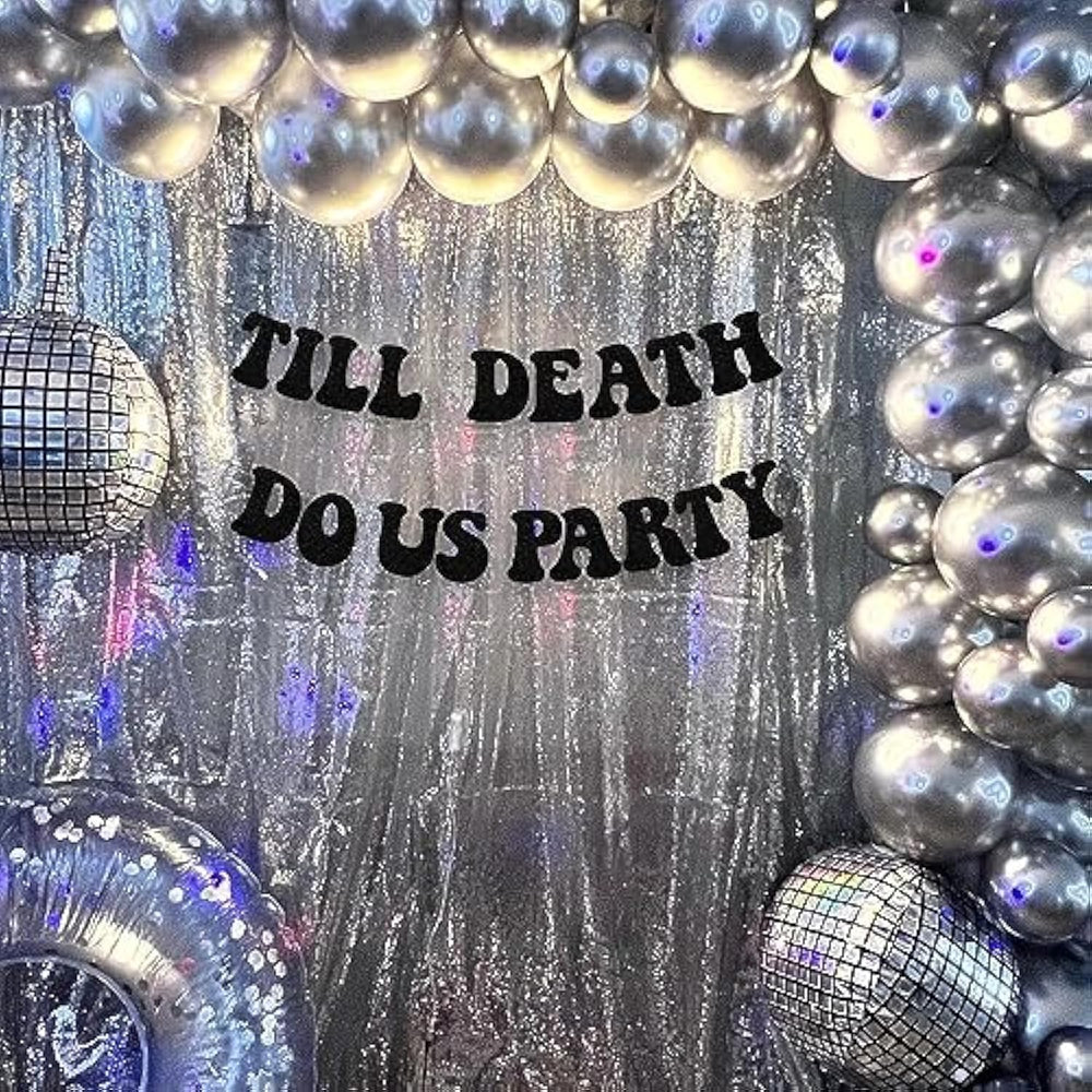 | Halloween Bach Party Decor: The Bridal Theme Banner Is Made Of Glitter Paper, The Glitter Is Not Getting Everywhere/On Everything | | Halloween Bachelorette Party Decoration: 1 Pcs Glitter Black Till Death Do Us Party Banner | | Halloween Glitter Banner Dimensions: Each Letter On The Sparkle Banner Measures 4.5 Inches High. Some Diy Required, It Will Take A Few Minutes To Put Together, The Spacing Between The Bunting Is Adjustable | | Halloween Bach Banner: Perfect For Halloween Bachelorette Party, Fall Bridal Shower, Halloween Black Wedding Decor Ideas, Gothic Bachelorette Party, Halloween Engagement Or Bridal Shower | | If You Have Any Problems Or Unsatisfied With Our Party Decorations, Please