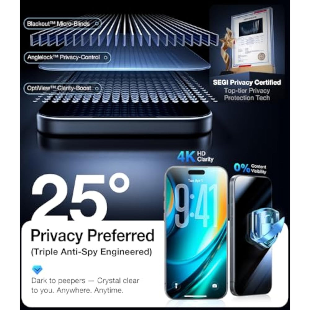 | ?Top Privacy Performance, Industry Leading 25° Ultra-Narrow Privacy Angle?'S Stands Out In The Market With Its Innovative 25° Anti-Spy Tech. With An Ultra-Narrow 25° Privacy Angle And A 130° Anti-Peep Coverage, Ensuring That The Content On Your Screen Belongs Only To You, No Matter Where Or When You View Your Iphone. Also, With Ultra-Hd Technology, Making Your Iphone 17 Pro Max Screen Appear Clearer Than Others. | | ?Unbreakable Top 9H+ Glass, The Excellent 2Nd Screen For Your Iphone?Boasting Unparalleled Shatter Resistance And Durability. And The Core Excellence Is The Top 9H+ Tempered Glass Material, Which Is Widely Applied In Aerospace And Military Fields For Its ? Shatter-Proof ? Scratch Wear Resistance ? Durability That Is 7-8 Times Higher Than Other Materials. Thus, Builds A Second Tough Screen For Your Iphone 17 Pro Max. | | ?Industry No.1 Military-Grade Shatterproof?