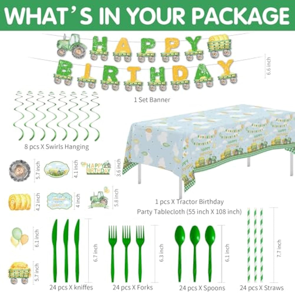 | ?Tractor Party Decorations?Celebrate Your Little Farmer’S Special Day With This Charming Tractor Decorations Party Tableware Set, Featuring Vibrant Green Tractors And Rustic Farm Details For A Fun, Countryside Party Atmosphere | | ?Complete Party Solution?This Tractor Birthday Plates And Napkins Decorations Tableware Can Accommodate Up To 24 Guests And Includes Everything You Need: 24Pcs 9'' Farm Tractor Dinner Plates, 24Pcs 7'' Tractor Dessert Plates, 24Pcs Napkins, 24Pcs Cups, 24 Sets Of Disposable Cutlery, 24Pcs Paper Straws, 8Pcs Tractor Party Swirls, 1Pcs Farm Tractor Happy Birthday Banner, 1Pcs Farm Tractor Tablecloth. Get These Farm Green Tractor Birthday Table Decorations To Elevate Your Celebration | | ?Premium Quality Materials?Made From Quality Materials, This Farm Tractor-Themed Party Decorations Is Stylish And Reliable. Sturdy Plates And Cups Handle Meals With Ease, While The Napkins And Tablecloth Add A Touch Of Elegance To Your Celebration | | ?Versatile Usage?Whether It'S A Tractor Birthday Bash, Barnyard Party, Farm-Themed Party, Baby Shower, Tractor Theme 1St 2Nd 3Rd Birthday, Or A Farm Animal-Themed Gathering, This Decoration Set Adds Charm And Fun That Kids Will Love | | ?Easy To Cleanup?Host A Party With Disposable Tractor Birthday Party Supplies. After The Fun, Just Toss Them Out For An Easy Cleanup. Enjoy More Time Celebrating And Less Time Cleaning | |