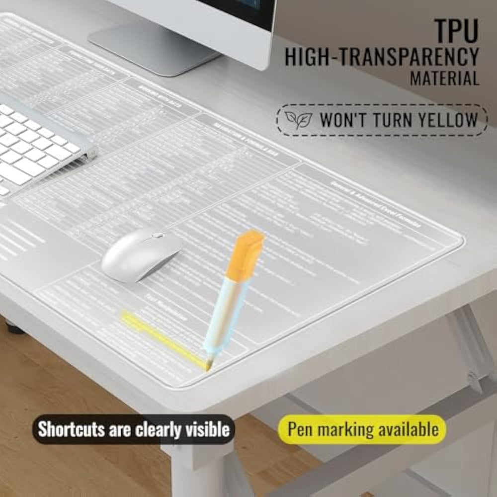 | ?Large Size, Non-Yellowing?Our Excel Cheat Sheet Desk Pad Is Made Of High-Quality Pvc Transparent Material, Ensuring It Remains Non-Yellowing With Long-Term Use. The Extra-Large Size Design Of 35.4*15.8 Inches Covers A Wider Desktop Area, With Larger Fonts For More Comfortable Viewing, And Helps You Keep Your Desktop Tidy And Organized, Making Your Office Space Well-Ordered. | | ? Coverage Of Excel Shortcuts?This Excel Mouse Pad Includes All The Common Excel Shortcuts And Formulas, Making It Easy For Both Beginners And Seasoned Users To Reference And Use, Simplifying Your Office Work. | | ?Waterproof And Stain Resistant, Multifunctional Design? The High-Quality Material Makes The Desk Mat Waterproof And Stain-Resistant, So There'S No Need To Worry About Spills. Just A Quick Wipe With A Tissue And It'S As Clean As New. It Can Also Be Used As A Placemat, Providing Convenience While You Enjoy Coffee Or Lunch At Your Computer. | | ?High-Definition Printing, Clear Fonts?The Excel Shortcuts Mousepad Features High-Precision Printing Technology, With Large And Sharply Clear Fonts That Won'T Fade Even With Long-Term Use, Allowing Easy Visibility Even On A White Desktop. | | ?Transparent For More Elegance?The Transparent Design Of The Desk Mat Enhances The Beauty Of Your Desk, Allowing The Shortcuts And Formulas To Be Clearly Visible Even On A White Or Cluttered Wood Grain Desktop. | |