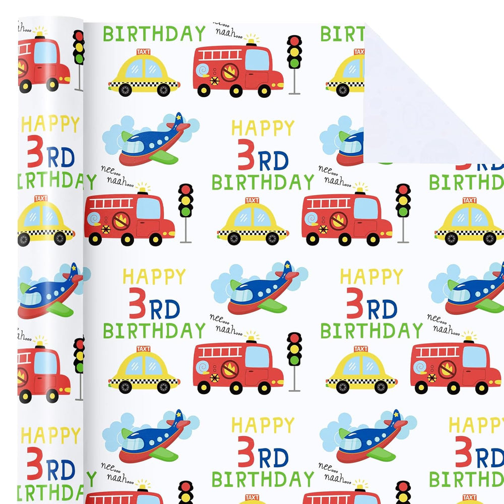 | Perfect Size: Each Roll Measures 17 Inches Wide X 16.5 Feet Long, Which Provides You With A Total Of 23.25 Square Feet Of Paper. It'S Perfect For Any Small Or Medium - Sized Gift And Is Also Very Convenient To Store. Birthday Design: 3Rd Birthday Design, Colorful Fire Trucks, Taxis, Airplanes And Traffic Light With "Happy 3Rd Birthday" Lettering Print. The Vivid Colors And Interesting Pattern Will Make Your Gift Stand Out. Premium Quality: Created With High-Quality Paper Materials, Thick And Not Easily Tear Or Rip. Item Came With Shrink Film To Prevent Wrapping Paper From Scratches And Reduce Dust. Use All Occasions: Ideal For 3Rd Birthday Parties, Whether It'S For A Child Excited About Their Special Day Or An Adult Looking For A Fun Wrapping Option, This Paper Is A Good Choice For Any Gift. It Is Also Great For Diy Craft Projects. Quality