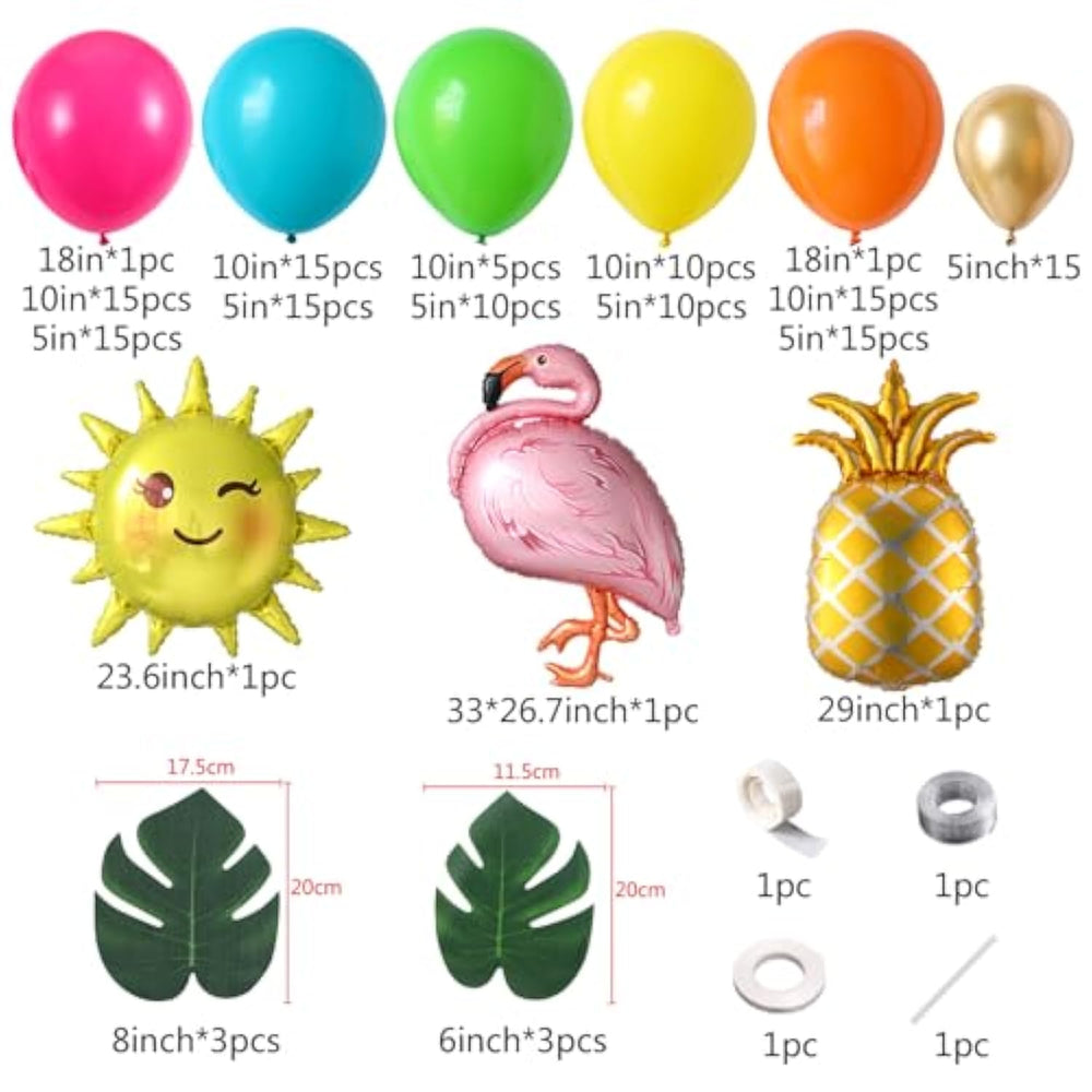 | Value Pack: You Will Get 142Pcs Colorful Latex Balloons; 1Pc 23.6Inch Sun Foil Balloon; 1Pc 33Inch Flamingo Foil Balloon; 1Pc 29Inch Pineapple Foil Balloon; 6Pcs Plam Leaves; 4Pcs Accessories. | | Tropical Party Decorations: The Tropical Flamingo Balloon Garland Arch Kit Is Very Suit For Summer Party, Hawaii Luau, Flamingo Party, Birthday Party, Pool Beach Party, Bridal Showers, Weddings, And Hawaiian Themed Events. | | Premium Material: All Of Our Latex Balloons Are Made Of Natural Non-Toxic Latex. All Materials Are Of High Quality And Good Safety, Please Feel Easy To Use. With Thick Skin, They Are Not Easy To Pop Out And Can Stretch Well. | | Easy Assembly: Long Balloon Stripe And Dot Glue Provided To Help Create Balloon Arches And Decorations. | | Warm Tips: Inflate Balloons To 90% And Avoid Sunburn, Overheat, Pointed Objects, And Strong Winds. Balloons May Take A Long Time To Deflate. | |