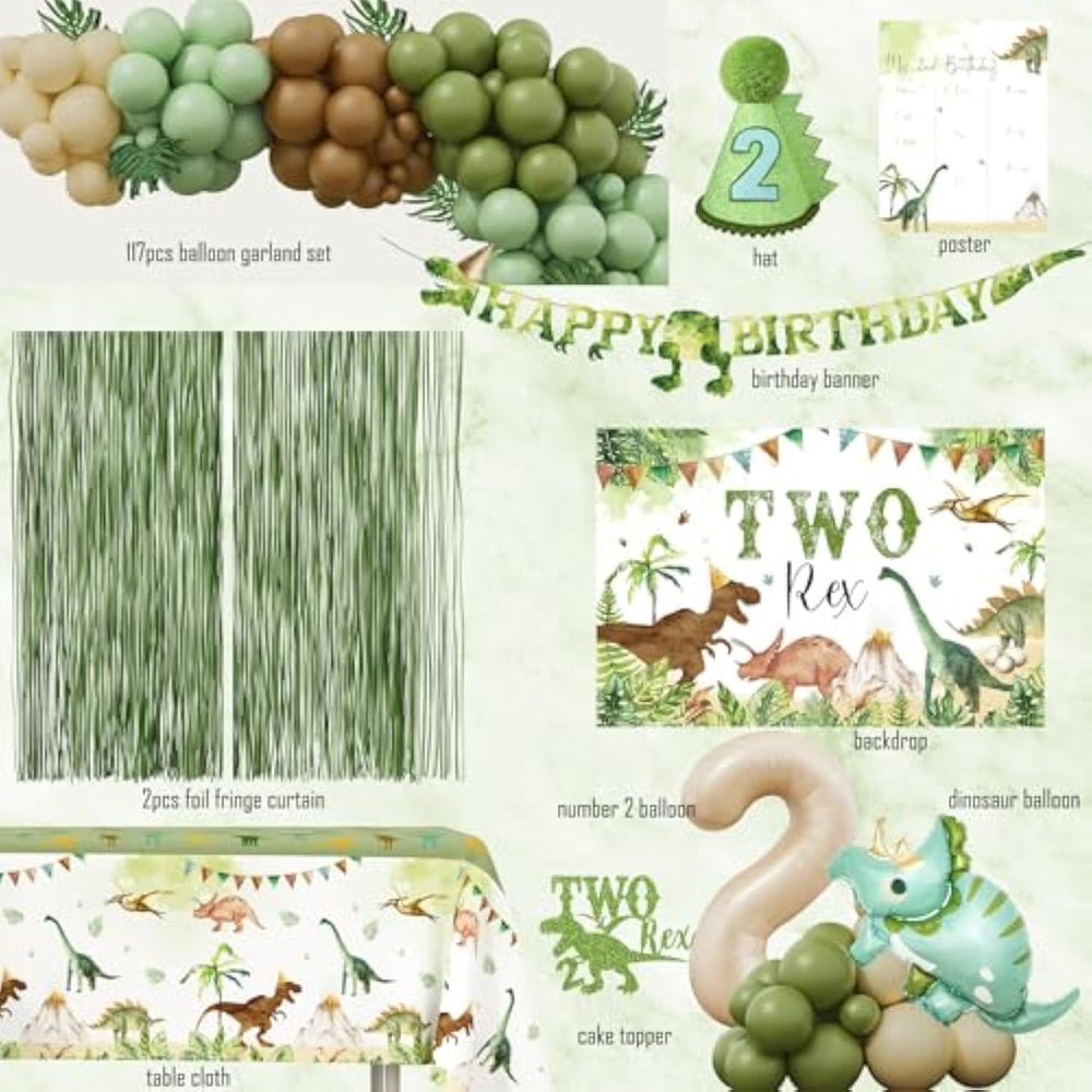 | Dinosaur 2Nd Birthday Decoration Set - If You Have Planned A Themed Party For Your Child, You Know That It Takes Countless Hours Of Research And Planning To Put It All Together. So, Our Birthday Decoration Set Will Help You Save Time If You Are Thinking Of Throwing The Perfect Dino Themed Party For Your Little Boy With Every Last Detail So That You Don'T Have To Spend Too Much Time Planning. | | Two Rex Birthday Party Decorations - Package Includes: Two Rex Backdrop, Dinosaur Table Cloth, Dinosaur Happy Birthday Banner, 117Pcs Dinosaur Balloon Garland Set, Dinosaur 2Nd Birthday Hat, Dinosaur 2Nd Birthday Milestone Poster, 2Pcs Foil Fringe Curtains, Two Rex Cake Topper, Number 2 Foil Balloon, Dinosaur Foil Balloon. | | Multiple Usage - The Two Rex Birthday Party Decorations Suitable For Two Rex Birthday Decorations, 2 Rex Party Decorations, Dinosaur Birthday Decorations, Baby Boy 2Nd Birthday Decorations. | | Easy To Install - No Need To Fret About Complicated Setups. Our Dino Balloon Arch Is Designed For Easy Installation, Making It A Breeze Even For First-Timers. With Clear Instructions And A Hassle-Free Assembly Process, You'Ll Have The Arch Up In No Time, Leaving You With More Moments To Cherish And Less Stress To Deal With. | | Attention - Please Use An Electric Or Hand Pump To Inflate The Balloons, Do Not Inflate The Balloon More Than 90% To Avoid Sudden Popping. Balloon Colors May Vary From Different Monitors And Screens. | |