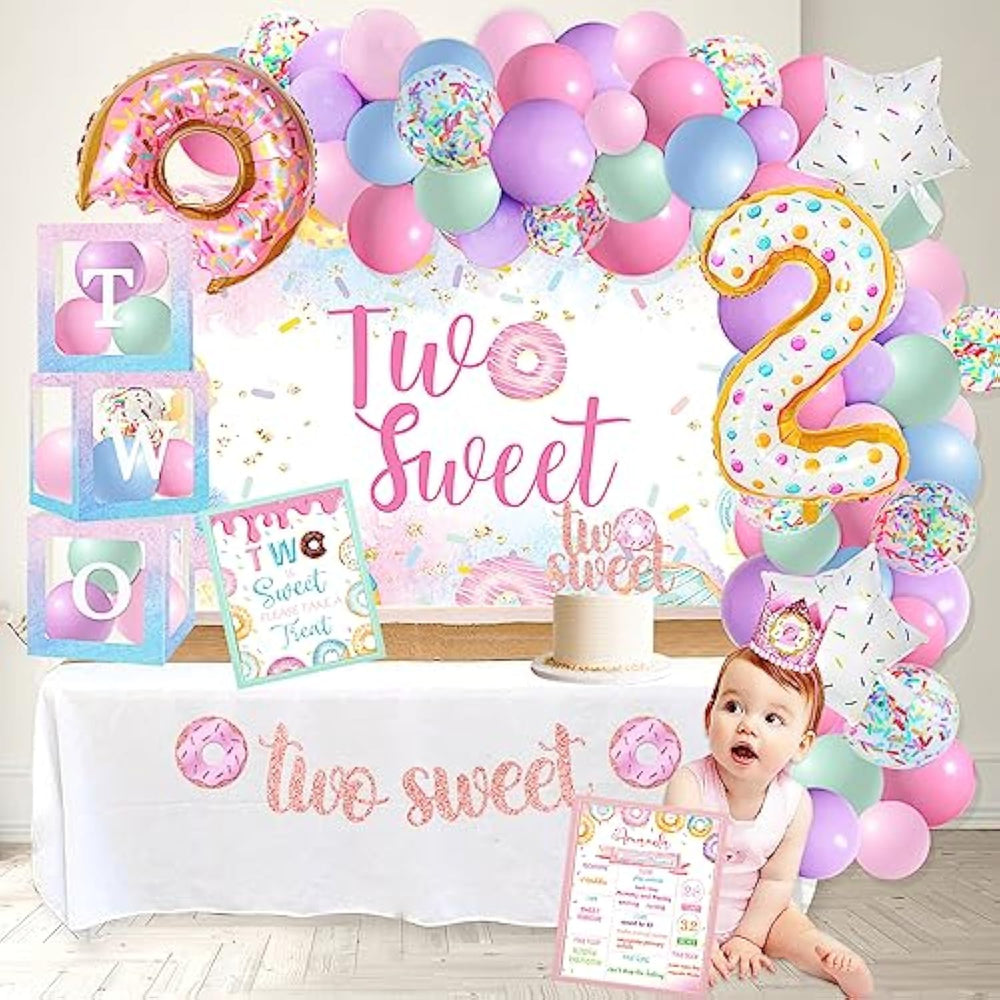 | Package Includes - Two Sweet Backdrop, 3Pcs Watercolor Design Balloon Box, Glitter Two Sweet Cake Topper, Glitter Two Sweet Banner, Two Sweet Donut Birthday Crown, 2Pcs 2Nd Birthday Milestone Poster, Number 2 Foil Balloon, Giant Donut Foil Balloons, 2Pcs Star Foil Balloons, 94Pcs Donut Theme Balloon Garland Set. | | Premium Quality Best Bang For Your Buck - Our Two Sweet 2Nd Birthday Party Decorations Are Made From Premium Quality Materials. Everything You’Ve Ever Thought Of For Your Baby Girl'S Two Year Old Birthday Party Is Now In This Set, Eliminate The Need To Go-Shopping For Individual Elements(Otherwise Ending Up Spending More Money And Wasting More Time). Moreover, Superior Print Quality And High Attention To Details Are Sure Make Your Baby'S 2Nd Birthday Parties Stand Out. | | Dreamlike Donut World - Specially Made Donut Birthday Party Decorations, Watercolor Design Two Sweet Backdrop And Balloon Box, Large Donut Balloons, Pastel Donut Balloons Garland, Glitter Two Sweet Banner And Cake Topper, Funny And Cute Birthday Poster, Create A Dreamlike Donut World For Your Baby, Cute And Sweet, Expressing A Good Wish For Baby'S Happy Growth And Leaving Everyone With One Beautiful And Unforgettable Memories. | |