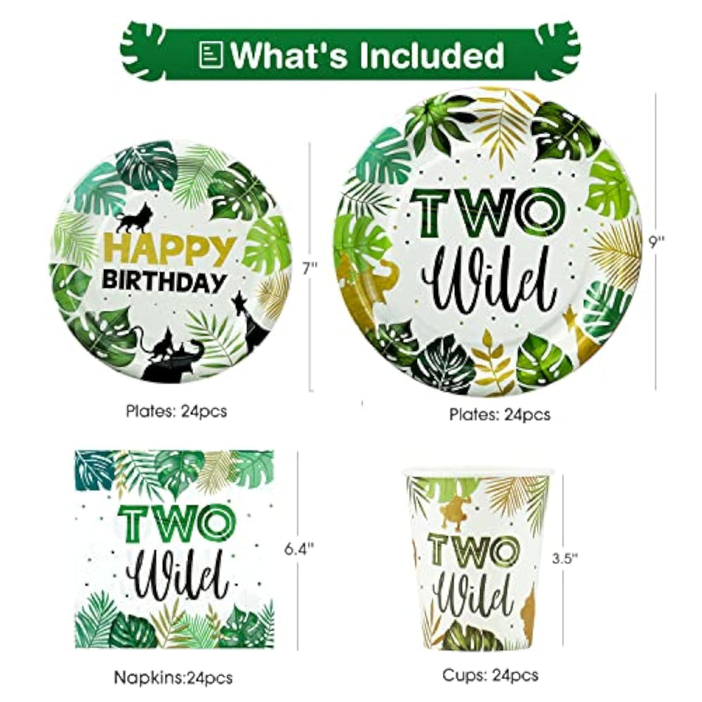 Throw a wild and unforgettable jungle-themed 2nd birthday with this all-in-one “Two Wild” party set! Perfect for boys and girls, the kit includes everything you need: safari-themed plates, cups, napkins, balloons, cutlery, straws, tablecloths, a “Born Two Be Wild” banner, a jungle backdrop, a cupcake topper, and a gold number "2" foil balloon—serving 24 guests. Made from durable, food-grade materials, the tableware is both safe and sturdy. With disposable supplies for easy cleanup, you can enjoy more fun and less fuss. Ideal for creating a vibrant and fun-filled safari celebration!
