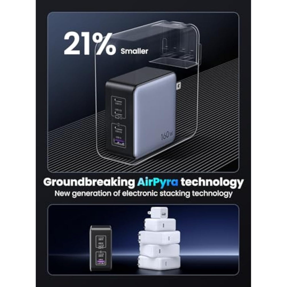 | Nexode X Series: UGREEN launches a new charging series Nexode X 160W USB C charger, which adopts more advanced chip and electronic stacking technology, making the products smaller, lighter, and more powerful | | 4 Ports Fast Charging: With 3 USB-C ports and 1 USB A port, this USB C charger provided 160W total output. It can fast charge your laptop, mobile phone, tablet at the same time, perfect for travel and business trip | | Fast Charging for your MacBook: With the PD3.1 protocol, USB C1 single port pumps max 140W to a MacBook Pro 16", which charge MacBook Pro 16" to 50% in 27 minutes. (must be used with USB-C to MagSafe 3 cable) | | Compact Design: A new generation of GaN technology brings you a faster and more powerful charging experience, making the 4-port Nexode X 160W charger 21% smaller than the original 140W USB-C charger | | Comprehensive Protection: Adopts upgraded Thermal Guard protection system 2.0, protect your devices from short circuit, over voltage, over temperature and over current | |