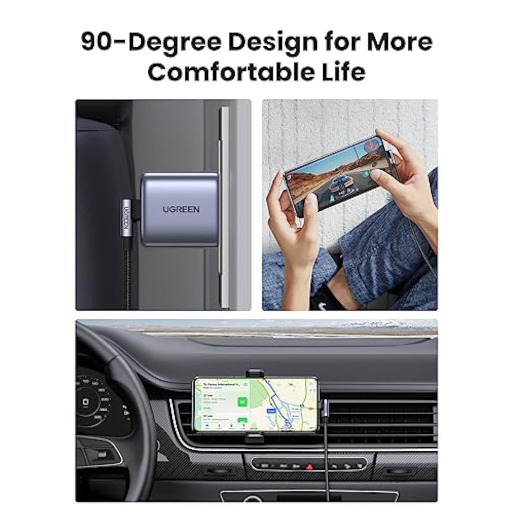 | Upgraded Unique Right Angle Design: Designed to provide a more comfortable grip, making watching movies, reading books and playing games more convenient and comfortable while charging your phone. [Note: The maximum thickness of the phone case allowed is 2mm/0.08inch.] | | 60W Fast Charging: The 90-degree USB C to USB C cable output quickly charges your iPhone 15 to 60% in 30 minutes at full speed, or fully charges your 13" MacBook Air in 1.5 hours when paired with a 60W PD charger. Backward compatible with 45W/30W/20W chargers | | Wide Compatibility: UGREEN 60W Type C fast charging cable is compatible with USB-C port devices, such as mobile phones (iPhone 15/15 Plus/15 Pro/15 Pro Max, Samsung S24/23/22/S21, Google Pixel 8/7, LG), tablets (iPad Air 5/4, iPad Mini 6, Galaxy Tab A9+), laptops (MacBook Air/Pro), switches and more USB-C devices | | Transfer Files in Seconds: This USB C to USB C cable provides transfer speeds of up to 480Mbps?moving 1GB of movies, music, documents, or entire photo libraries in less than a minute.[Note: Video output and monitor extension are not supported.] | |