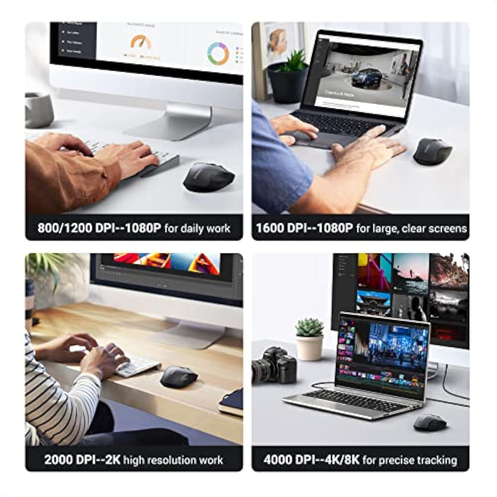 | Full-Size Ergo Mouse: Following the hand's natural curve, soft rubber grips, broad palm area, and sculpted sides for extra grip greatly enhance comfort and relieve hand and wrist strain | | 5 Adjustable DPI: UGREEN wireless mouse has 5 adjustable DPI levels (4000/2400/1600/1200/800), you can freely choose the cursor speed to meet various needs of gaming, office, home and more | | Ultra Quiet Mouse: This wireless computer mouse for laptops is designed with low noise, which can reduce click sound by 90%, which is super quiet whether clicking a button, scrolling, or moving the mouse, making it an ideal computer mouse for meeting room, library, bedroom | | 18-Month Battery: UGREEN wireless mouse has an extended battery life of up to 18 months; Practi
