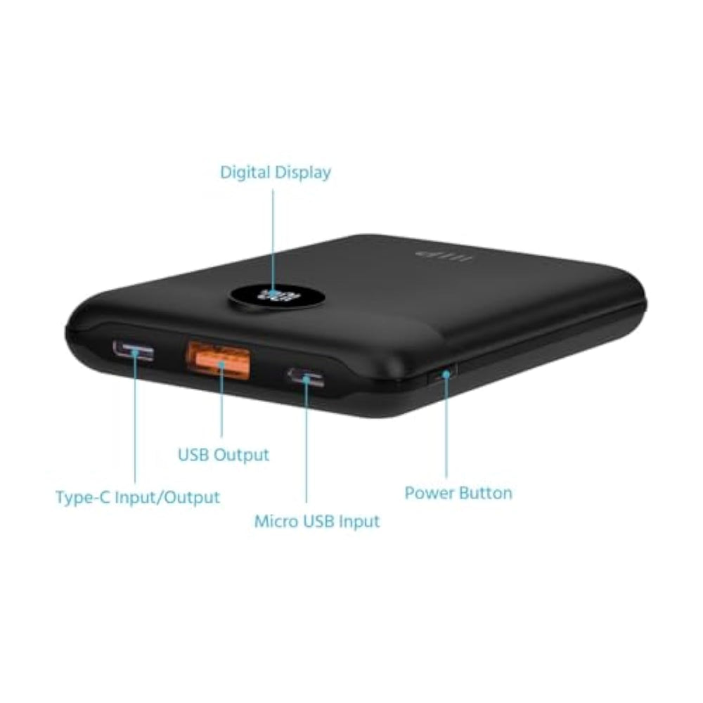 | Ultra Compact, Slim And Lightweight: One Of The Most Compact, Slimmest, And Lightweight 10,000Mah Power Banks That Easily Fit Into Your Pocket. | | Fast Charging: Usb A Output Supports Qc3.0 With Max Power 22.5W, More Than Twice As Fast As 10W Output. Usb C Output Supports Pd3.0 With Max Power 20W, Optimized For Charging The Latest Iphones. Micro B And Usb C Inputs Support 18W Max, Allowing Quick Re Charge Of Battery. | | Digital Led Display: Led Indicator Clearly Lets You Know The Remaining Battery Level In Numerical Value To Take Out The Guesswork. | | Wide Compatibility: Micro B, Usb A, Usb C Ports Allow Flexibility And Are Compatible With All Mobile Devices. | | Charging Cable Included: A Usb A To Usb C Charging Cable Is Included. | |