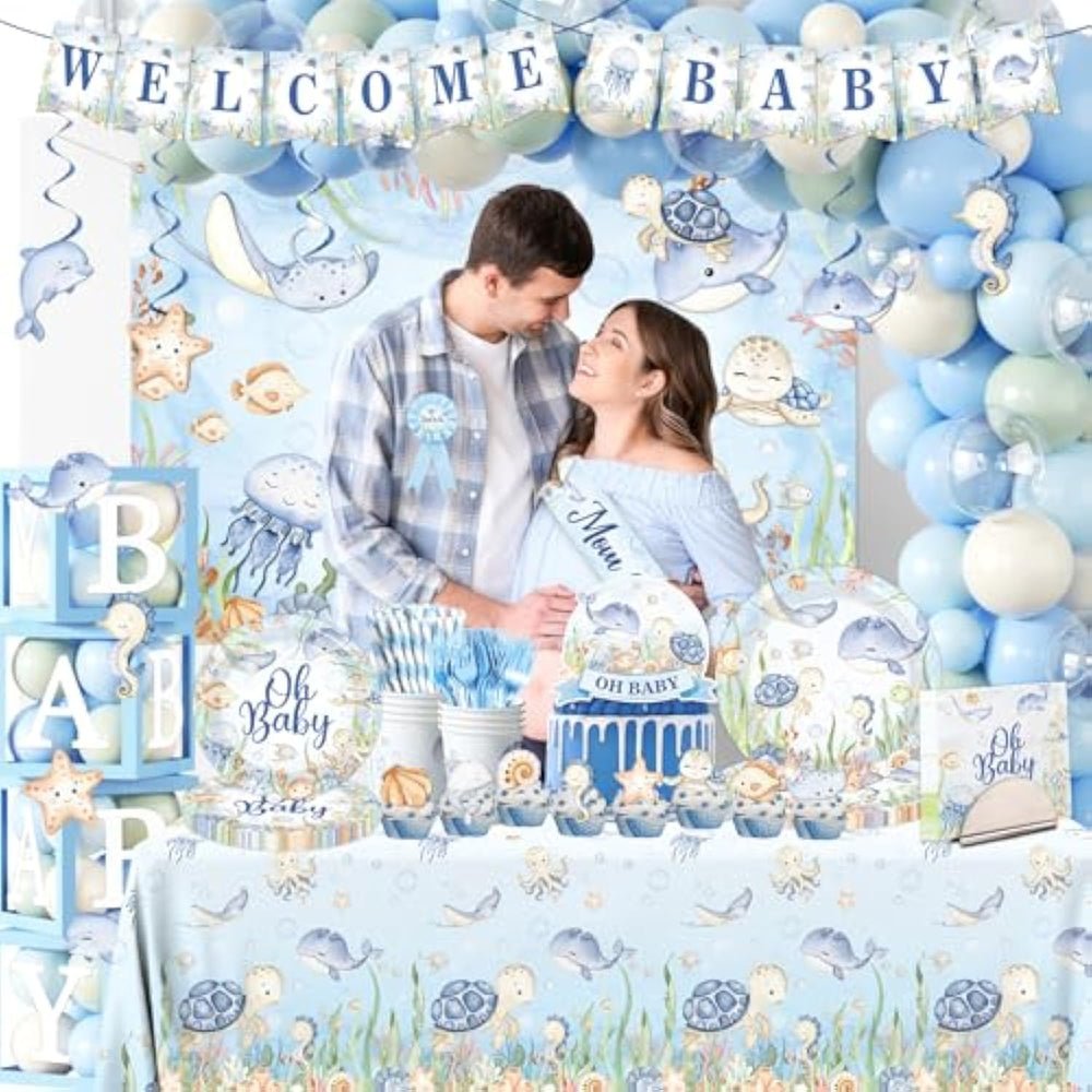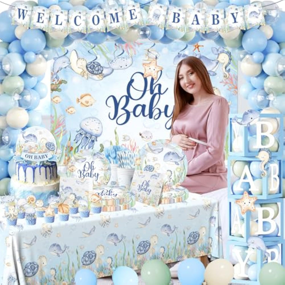 | ?Under The Sea Theme?Our Ocean Baby Shower Decorations Featured With All Kinds Of Marine Lives Swimming Around Cheerily Under The Sea, Such As Whales, Turtles, Octopuses, ?Jellyfish, Various Fishes, Starfishes And So On, That Is Embellished With Dancing Seagrass, Bubbles And Elegant Letters “Oh Baby” “Welcome Baby”. Fantastic Design Creates A Vibrant And Joyful Atmosphere For Under The Sea Baby Shower. | | ?Deluxe Set-Serve 24?286Pcs Under The Sea Party Decorations Include 24 Paper Dinner Plates (9"), 24 Paper Dessert Plates (7"), 24 Square Paper Napkins (6.5" Folded), 24 Paper Cups, 24 Plastic Forks, 24 Plastic Straws, 90 Latex Balloons With 5 Colors (Blue, Light Blue, Sage Green, Beige And Clear) And 2 Sizes (10" And 5"), 4 Balloon Boxes With 8 "Baby" Letters, 4 Cutout Cards, 1 Oh Baby Cake Topper, 24 Cupcake Toppers, 1 Mom To Be Sash, 1 Dad To Be Pin, 1 Oh Baby Backdrop (59" X 39.4"), 1 Tablecloth (87" X 51.2"), 1 Welcome Baby Banner With 6 Hanging Swirls, Strings And Stickers Are Attached. | | ?Everything You Need In 1 Kit?Make Your Party Come To Life With All-In-1 Sea Party Decorations! It Includes Every Essential For An Under The Sea Themed Celebration, Which Is Very Convenient. You Can Diy These Decorations With Infinite Imagination And Creativity! Ocean Theme Baby Shower Decorations Are Perfect Photo Booth Props For Taking Pictures With Family And Friends, Which Will Leave Precious Memories. | | ?High Quality?Beach Baby Shower Decorations Are Made Of Premium Material, That Is Non-Toxic And Sturdy. Thick Paper Plates Are Not Easy To Bend, Fold Or Tear And Fade-Resistant; Napkins Are Soft To Touch, Not Easily Tear And More Absorbent With 2 Layers. High Quality Thick Latex Balloons Make It Less Likely To Pop; Cardboard Boxes Are Foldable And Lightweight For Taking Out And Convenient Storage. Designed With Vivid Pattern That Is Printed Clearly. | | ?Occasions?Underwater Party Decorations Are Ideal For Boys And Girls’ Baby Shower Or Gender Reveal Party, Such As Under The Sea Baby Shower, Underwater Baby Shower, Ocean Baby Shower, Sea Baby Shower, Beach Baby Shower, Summer Pool Baby Shower, Sea Animal Baby Shower, Tropical Fish Themed Party, Whale Themed Party, Turtle Themed Party, Mermaid Themed Party, Etc. Impress Your Guests And Have An Amazing And Unforgettable Time! | |